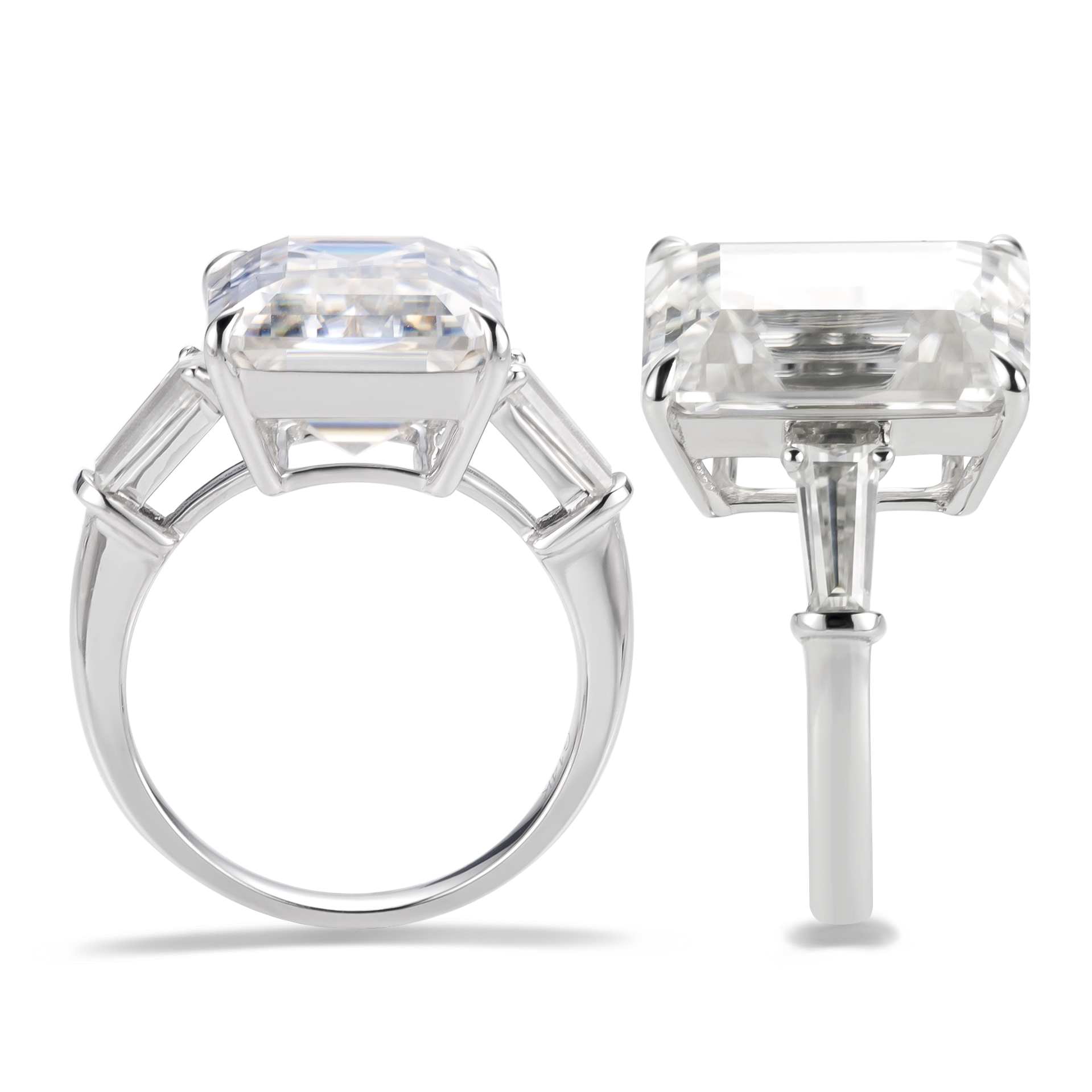 Los diamantes baguette, con sus limpias facetas rectangulares, complementan a la perfección la geometría de la talla esmeralda, creando una declaración arquitectónica cohesiva. Su forma cónica aporta movimiento visual, a la vez que conserva el perfil elegante y estilizado del anillo.