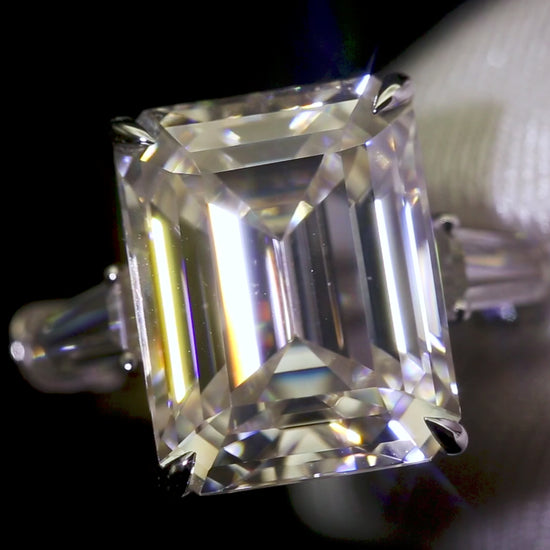 Las facetas grandes y abiertas del corte esmeralda facilitan su limpieza y mantenimiento. Simplemente use agua tibia con jabón y un cepillo suave para mantener su anillo reluciente. El diseño de corte escalonado muestra huellas dactilares y aceites con mayor facilidad que los cortes brillantes, por lo que una limpieza regular mantendrá su mejor aspecto. Recomendamos una inspección profesional cada 6 a 12 meses para garantizar la seguridad de las garras. Las piedras laterales engastadas al ras están bien protegidas y son ideales para el uso diario.
