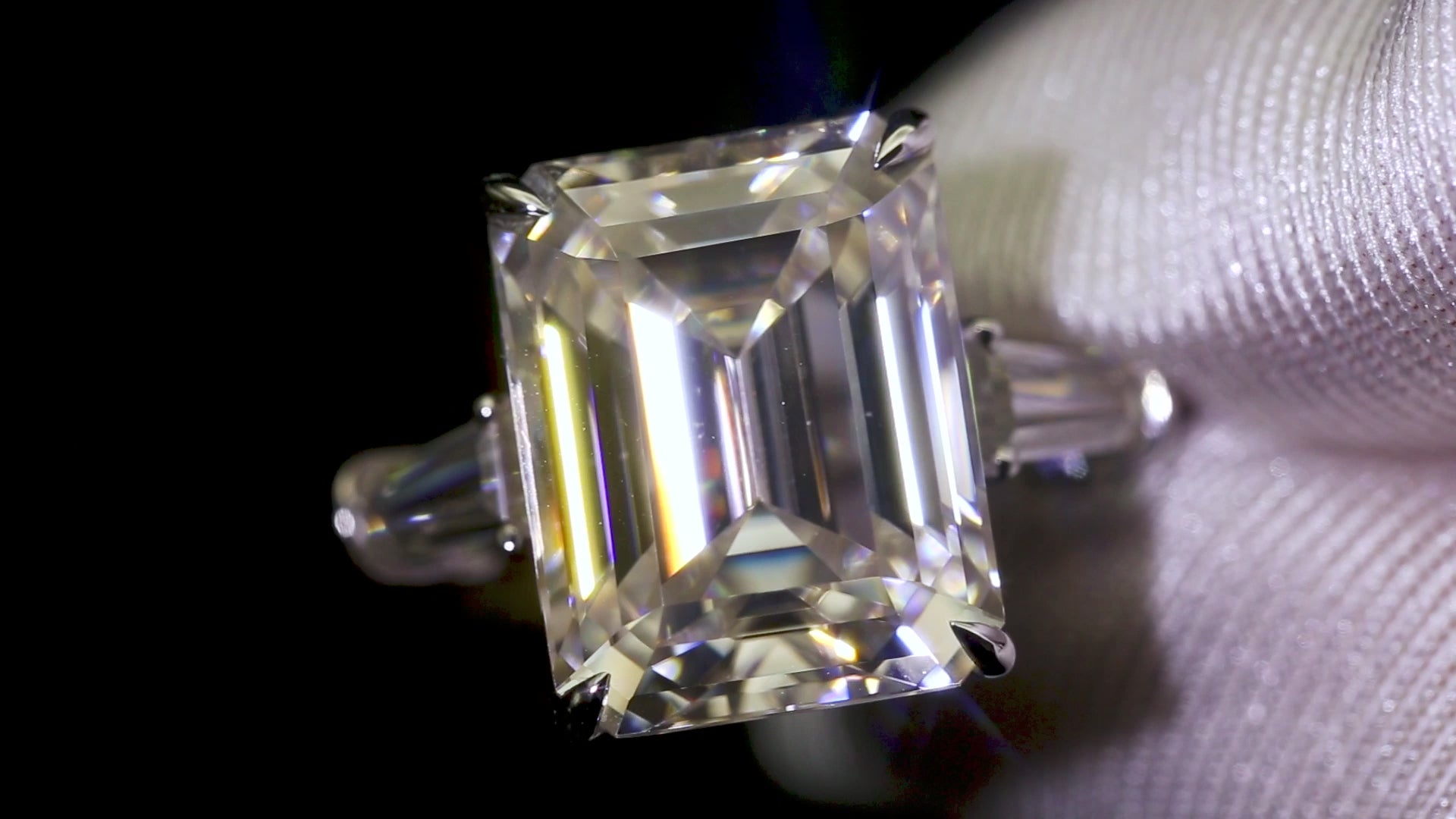 En su centro se encuentra un diamante de talla esmeralda cultivado en laboratorio , elegido por su elegancia arquitectónica y sus facetas de efecto espejo. La talla esmeralda, con su forma rectangular alargada y geometría escalonada, ofrece un brillo refinado que prioriza la claridad sobre el fuego, ideal para quienes aprecian el lujo discreto y el diseño de inspiración art déco.