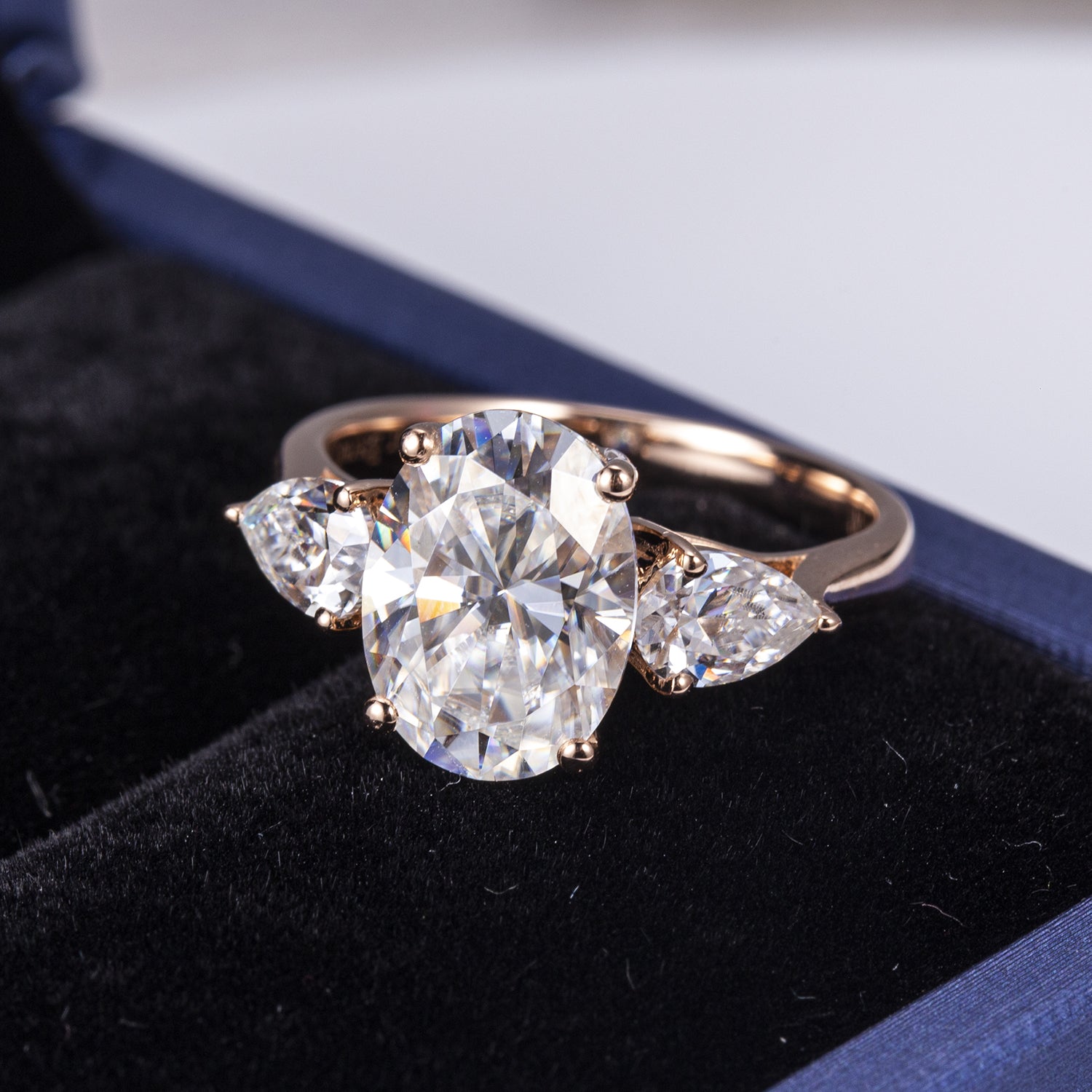El diseño de tres piedras ha sido adorado a lo largo de la historia y sigue siendo una opción popular entre celebridades e iconos de estilo. La combinación de formas ovaladas y de pera crea una estética celestial única, como diamantes orbitando en una luz dorada, representando el ciclo eterno del amor.