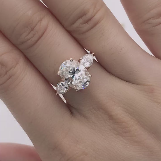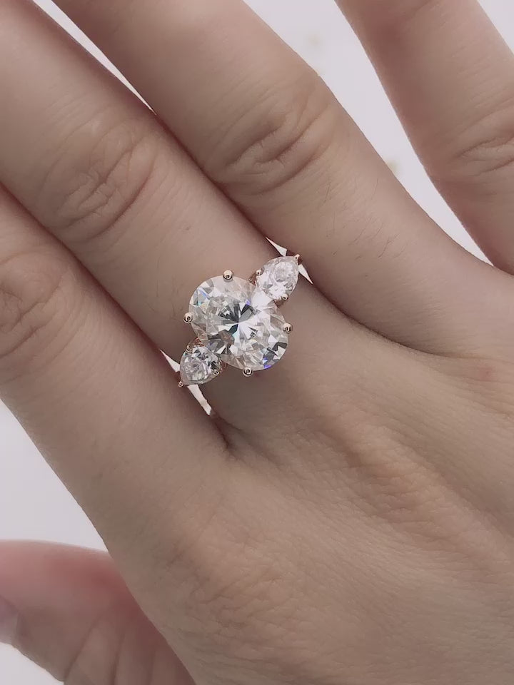 Flanqueando la piedra central se encuentran dos diamantes de talla pera cultivados en laboratorio , delicadamente angulados para reflejar la curvatura del óvalo y crear una sensación de movimiento y armonía. Esta composición de tres piedras simboliza el viaje del amor (pasado, presente y futuro), a la vez que ofrece una silueta equilibrada y luminosa que captura la luz desde todos los ángulos.