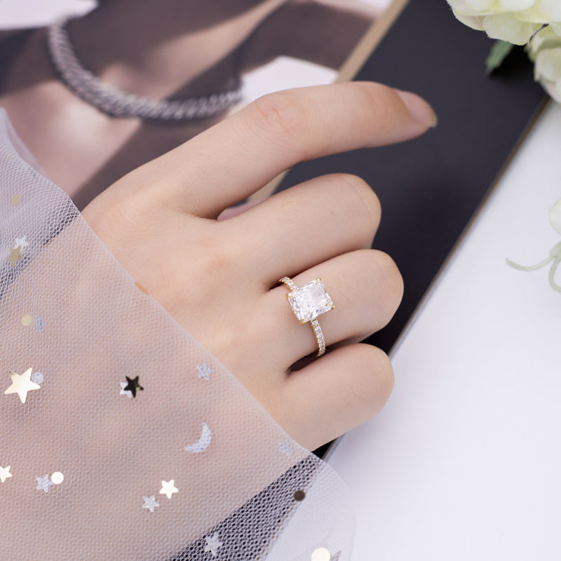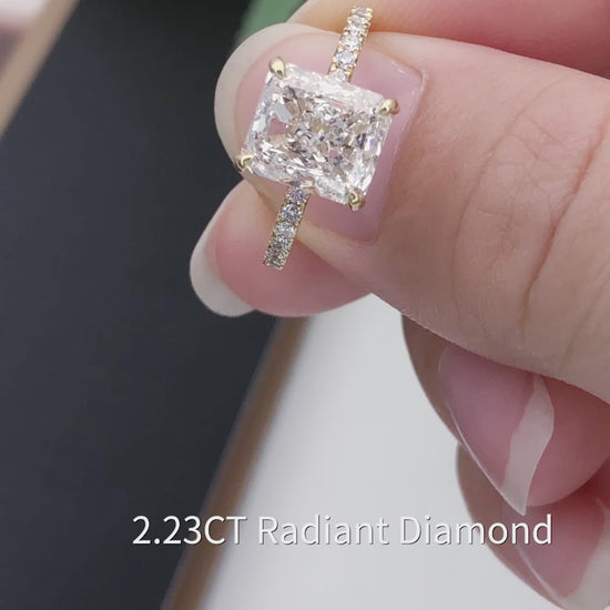 A lo largo del cuerpo, diamantes redondos brillantes cultivados en laboratorio se engastan en pavé hasta la mitad, aportando un brillo continuo que complementa la piedra central sin opacarla. Este equilibrio meticuloso garantiza que el diamante de talla radiante sea el centro de atención, mientras que la banda pavé aporta el brillo perfecto.