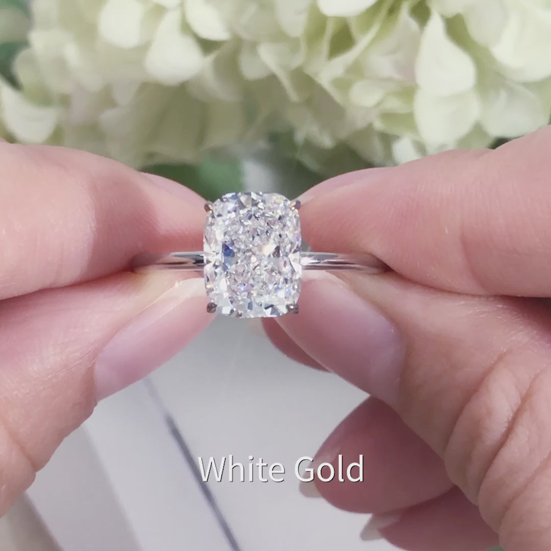 En su centro se encuentra un diamante de talla cojín, cultivado en laboratorio , de aproximadamente 1,5 quilates , elegido por su silueta cuadrada suavizada y su brillante tallado. La talla cojín combina las románticas curvas de un diamante redondo con la elegancia geométrica de una talla princesa, ofreciendo a la vez fuego y profundidad.