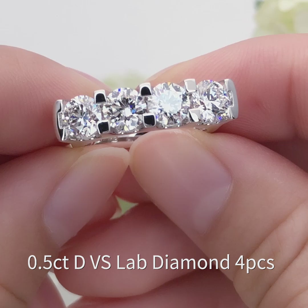 Este anillo luce cinco diamantes redondos brillantes cultivados en laboratorio , cada uno engastado en cuatro puntas que maximiza la exposición a la luz y el brillo. Las piedras están distribuidas uniformemente a lo largo del anillo, creando un armonioso ritmo de luz que simboliza la unidad, el crecimiento y el amor eterno.