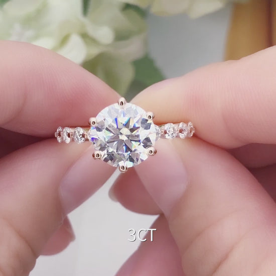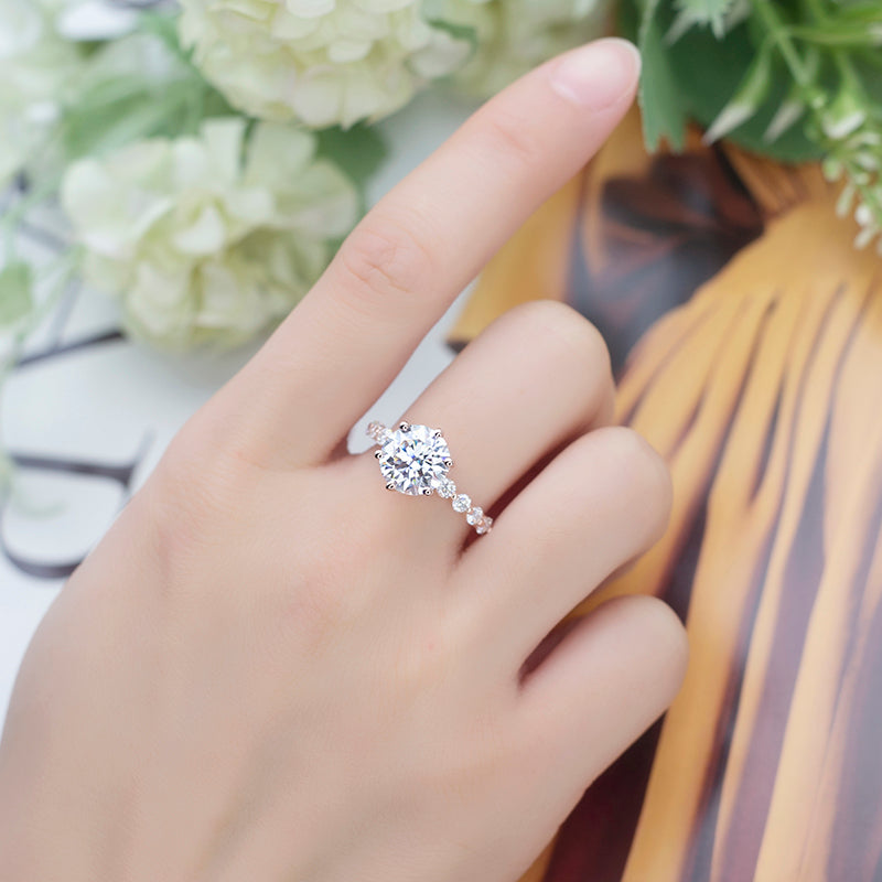 En su centro se encuentra un diamante redondo brillante cultivado en laboratorio , de aproximadamente 1,5 quilates , engastado en un engaste de seis puntas que eleva la piedra por encima de la banda, permitiendo la entrada de luz desde todos los ángulos. El diseño de seis puntas ofrece mayor seguridad, a la vez que mantiene una apariencia abierta y etérea que maximiza la exposición del diamante a la luz.