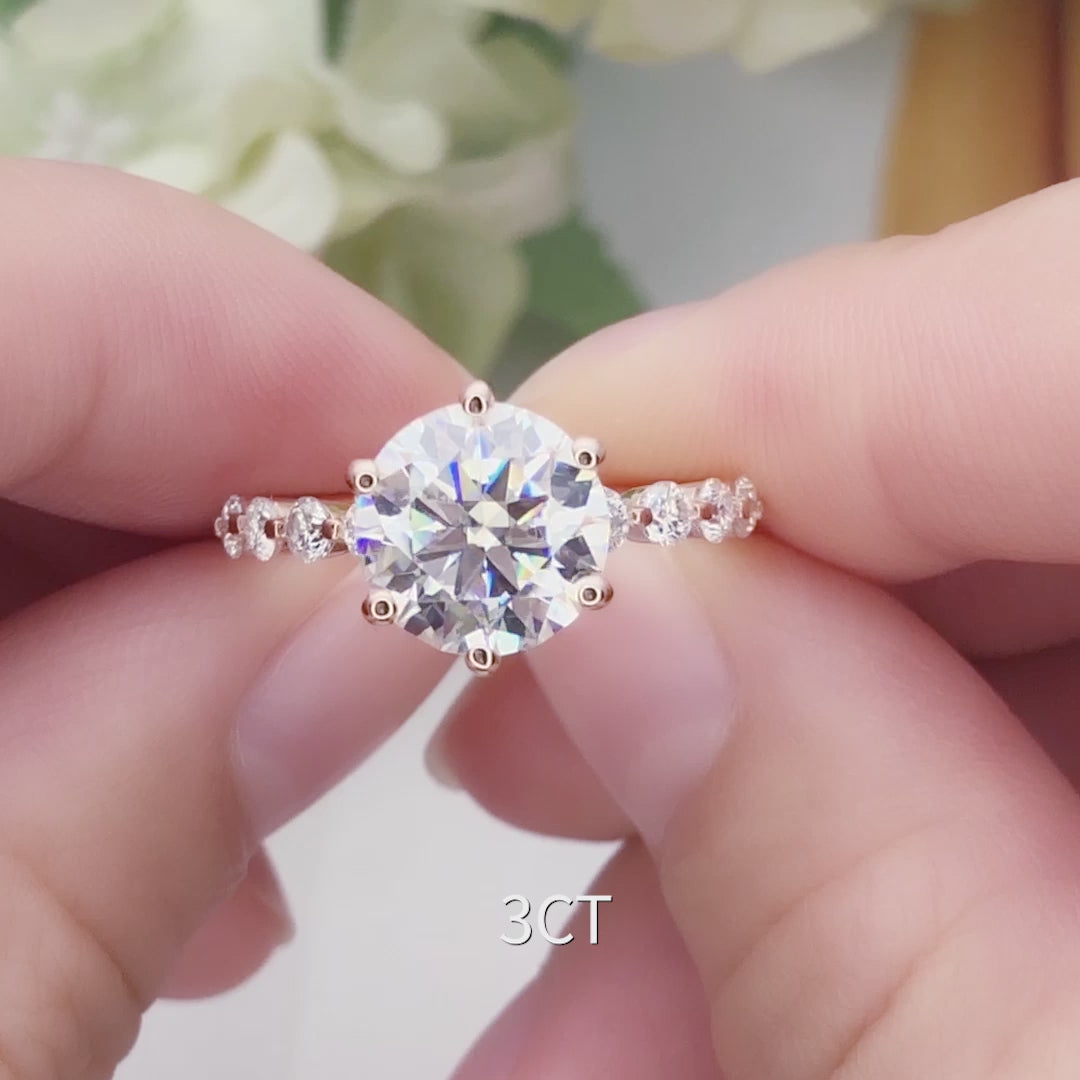 Eco-596 es un anillo de compromiso de oro rosa que presenta un diamante brillante redondo creado en laboratorio en un engaste de seis puntas, con una banda pavé graduada: un anillo que captura el fuego silencioso del compromiso en forma escultórica.