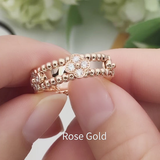 Cada flor se compone de cuatro o cinco pétalos , incrustados con diamantes redondos brillantes cultivados en laboratorio (con un peso total aproximado de 0,8 quilates ) y centrados con una piedra ligeramente más grande para crear profundidad y luminosidad. Los pétalos están esculpidos con precisión, ofreciendo una textura táctil que contrasta a la perfección con las suaves bandas de cuentas.