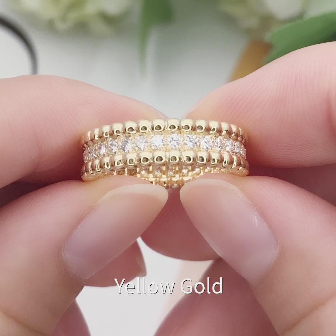 Flanqueando el canal de diamantes se encuentran dos filas de cuentas de oro pulido , que añaden profundidad y un contraste táctil a la elegante geometría del centro. Estos bordes de cuentas evocan una sensación de ritmo y artesanía, que evoca las técnicas de orfebrería clásicas reinventadas para una elegancia moderna.