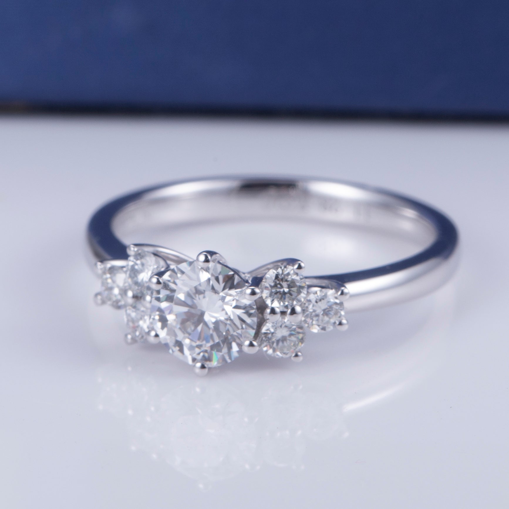 Esta composición en trío evoca una sensación de continuidad y plenitud, ideal para marcar los compromisos más significativos de la vida. El diseño de tres piedras simboliza tradicionalmente el viaje del amor: el pasado compartido, el presente que viven y el futuro que construirán juntos.