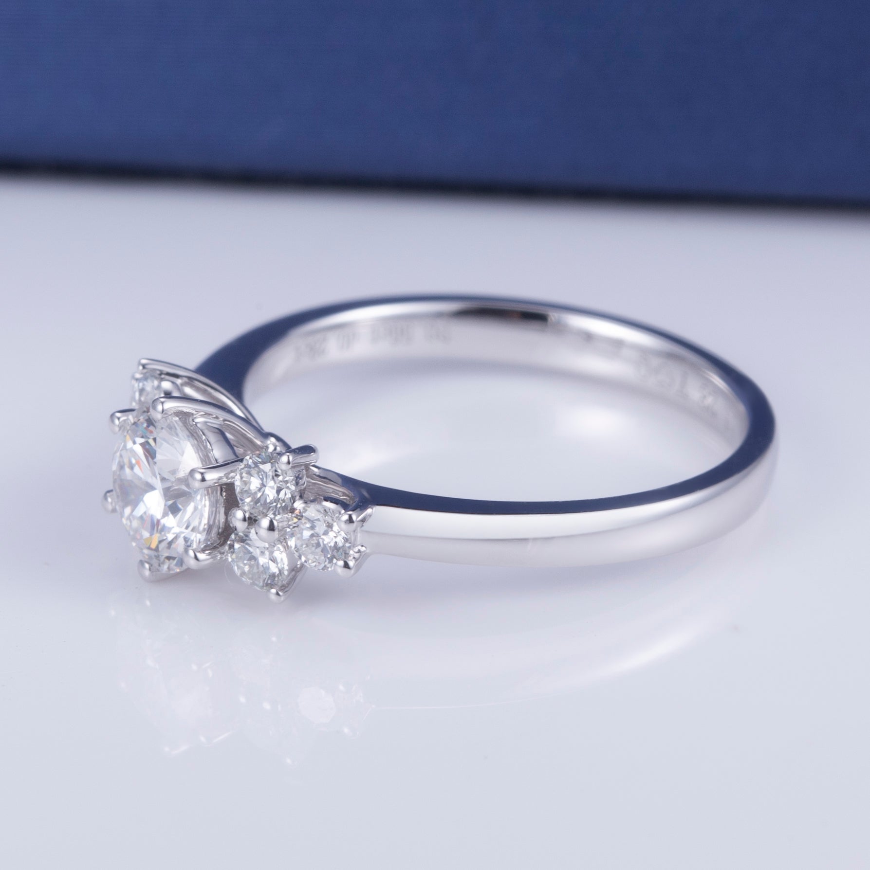 Eco-624 es un anillo de compromiso clásico de tres piedras que presenta un diamante brillante redondo cultivado en laboratorio flanqueado por seis diamantes decorativos, elaborado en oro blanco de 18 quilates: un anillo que celebra la armonía del pasado, el presente y el futuro en un abrazo escultural.