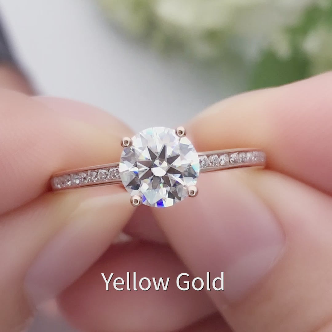En su corazón se encuentra un diamante brillante redondo cultivado en laboratorio , de aproximadamente 1 quilate , engastado en un engaste clásico de cuatro puntas que realza la piedra para revelar todo su brillo. El corte redondo, con sus 58 facetas , es venerado por su simetría y brillo, lo que lo convierte en la opción más icónica para un amor eterno.