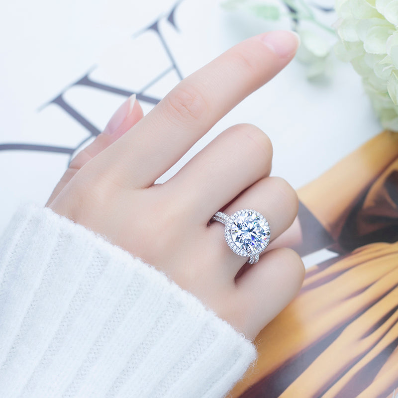 Un halo de diamantes redondos cultivados en laboratorio rodea la piedra central, meticulosamente engastados para realzar el tamaño y la luminosidad de la gema central. La geometría del halo evoca un aura celestial, transformando el anillo en un escultural faro de luz.