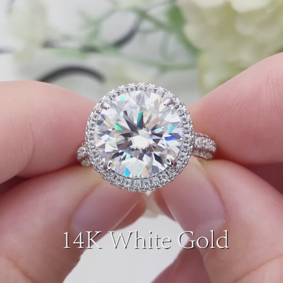Eco-635 es un lujoso anillo de compromiso con halo que presenta un diamante brillante redondo creado en laboratorio, rodeado por un halo y un cuerpo dividido pavé, elaborado en oro blanco de 18 quilates: un anillo que corona el amor con brillo y gracia.