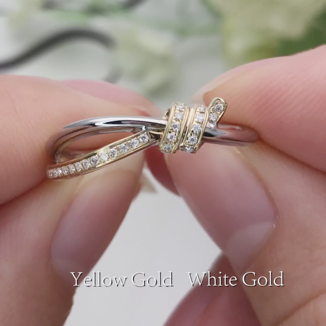 La banda de oro blanco ofrece una base elegante y pulida, fresca y brillante, que crea el marco perfecto para el brillo de los diamantes. Por otro lado, el detalle de oro rosa aporta calidez y profundidad, envolviendo el nudo como una cinta de luz.