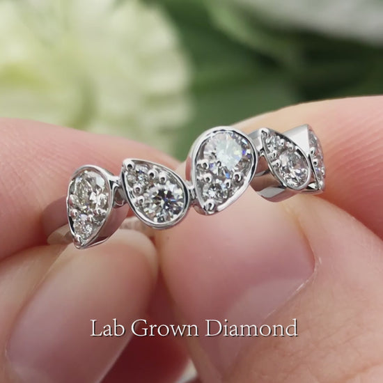 Juntas, las formas de pera y óvalo forman una cadencia visual que se extiende por el dedo como una constelación de luz. Cada piedra se selecciona cuidadosamente por su claridad y fuego, y el patrón alternado crea una estética dinámica y armoniosa.