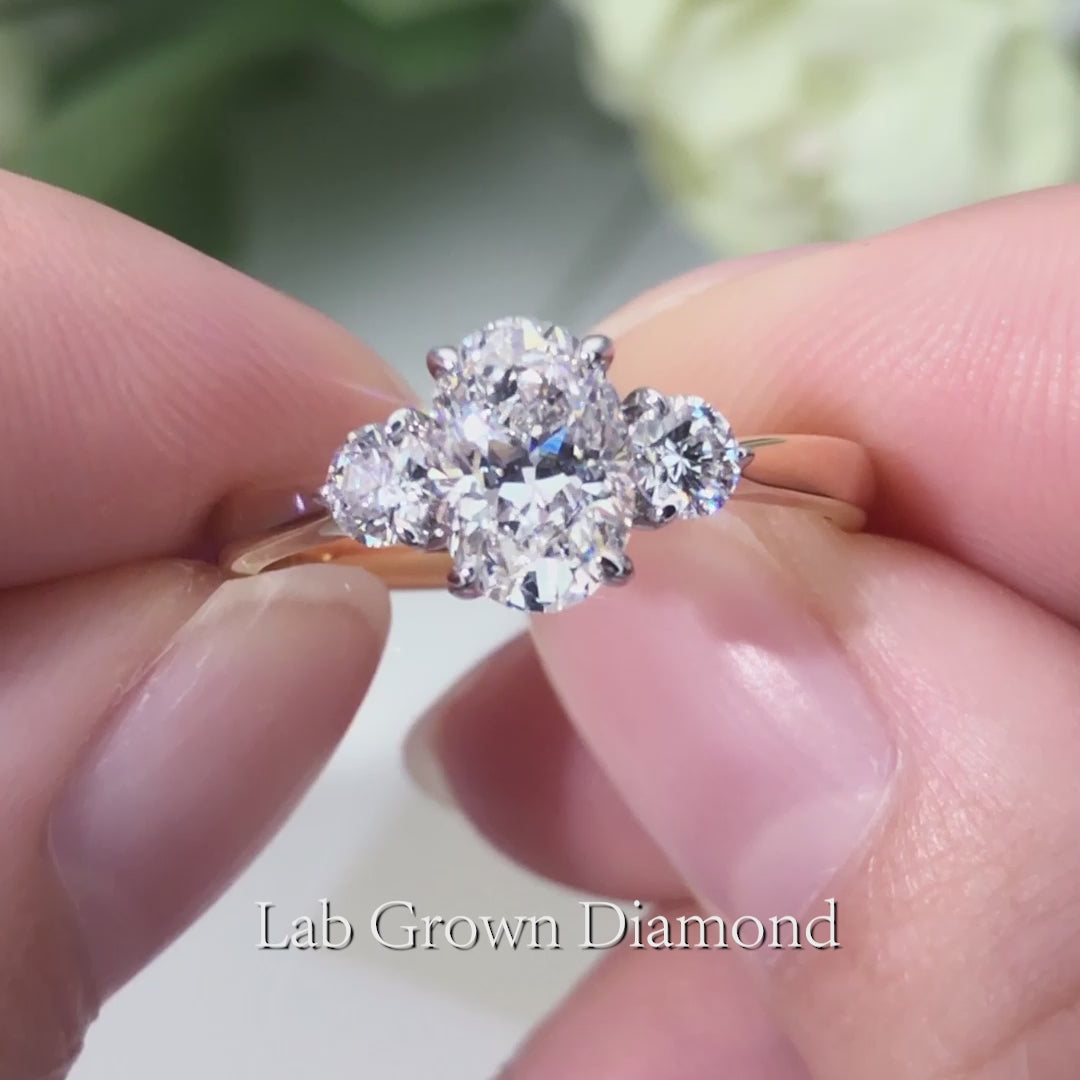 El diseño de tres piedras representa tradicionalmente el viaje del amor: el pasado compartido, el presente que viven y el futuro que construirán juntos. Las brillantes piedras laterales redondas equilibran perfectamente el centro ovalado, creando una composición armoniosa que se siente a la vez clásica y contemporánea.