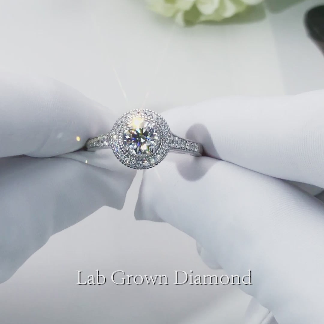 Eco-659 es un anillo de compromiso de doble halo que presenta un diamante brillante redondo creado en laboratorio, rodeado de halos concéntricos y hombros pavé en oro blanco de 18 quilates: un anillo que florece con brillo y susurra de eternidad.