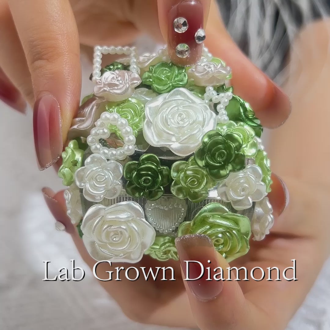Entre los segmentos, pequeños diamantes cultivados en laboratorio se incrustan como rocío sobre las hojas, aportando brillo sin opacar el ritmo natural del diseño. Esta composición combina la elegancia botánica con la artesanía moderna, ideal para quienes buscan simbolismo y sostenibilidad en sus joyas.