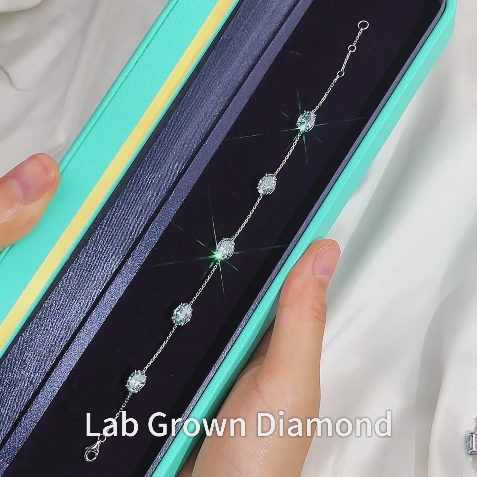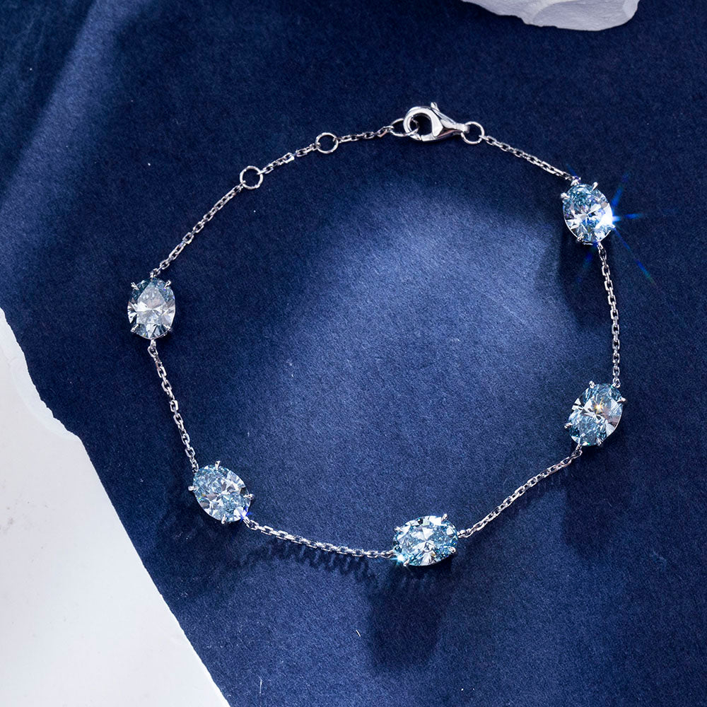 Elaborada en oro blanco de 18 quilates , la pulsera presenta una fina cadena adornada con seis gemas de talla redonda uniformemente espaciadas. Las piedras alternadas (zafiros azules y diamantes cultivados en laboratorio) están engastadas en garras minimalistas que permiten el paso de la luz, realzando su brillo y color.