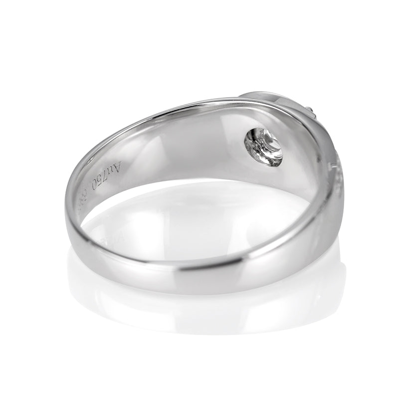 Estas piedras decorativas, con un peso total aproximado de 0,2 ct, aportan un brillo sutil y equilibrio, creando un ritmo visual que atrae la mirada hacia el interior. La alianza está forjada en oro blanco de 18 quilates, pulida con un acabado de espejo y diseñada con un perfil elegante y masculino.