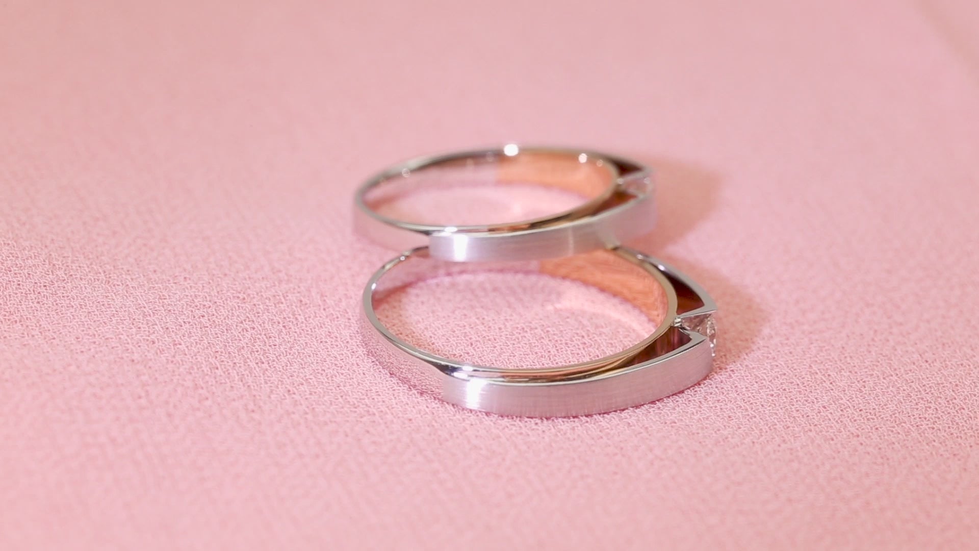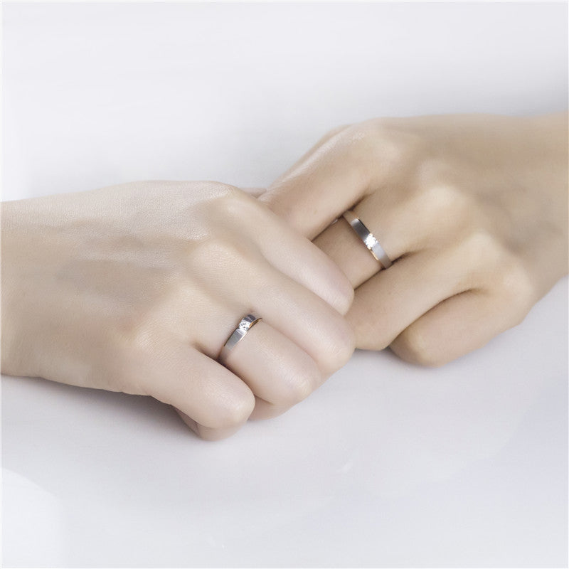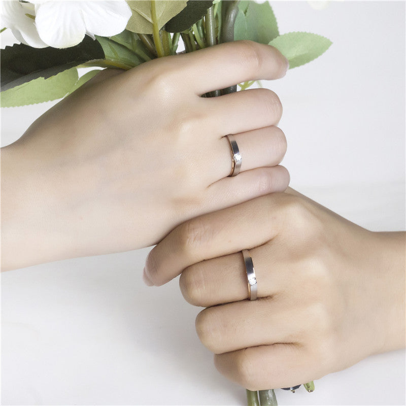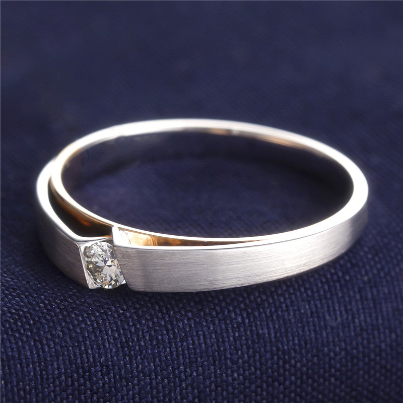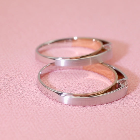 En el centro de cada anillo se encuentra un diamante redondo brillante cultivado en laboratorio , de aproximadamente 0,08 ct , engastado en un bisel al ras que se integra a la perfección con la superficie. La disposición del diamante es sutil pero radiante, ofreciendo un brillo refinado que complementa la silueta minimalista del anillo.