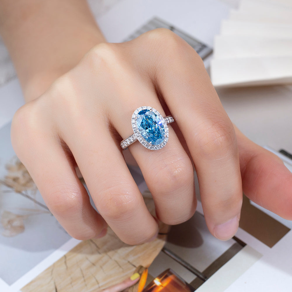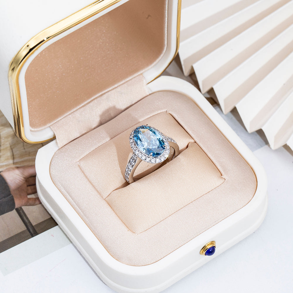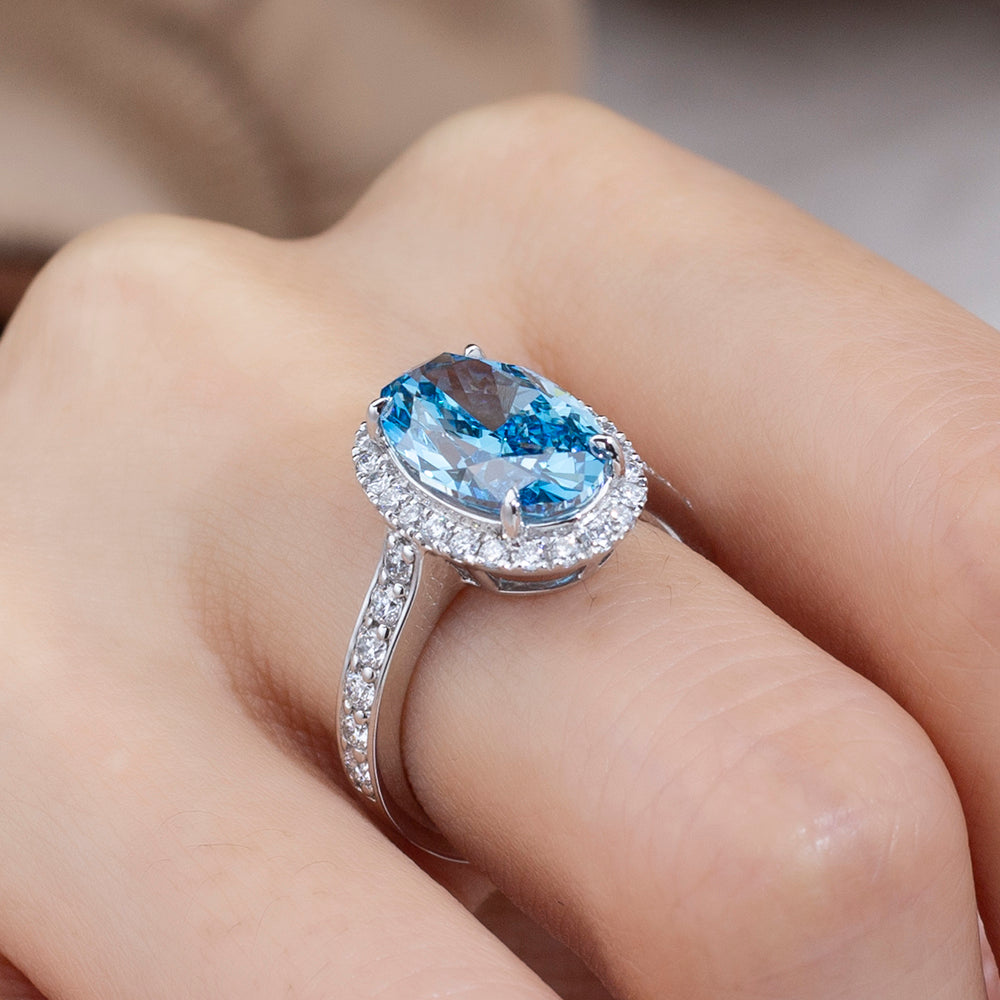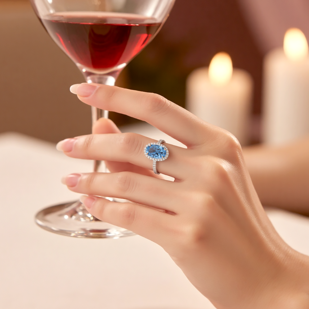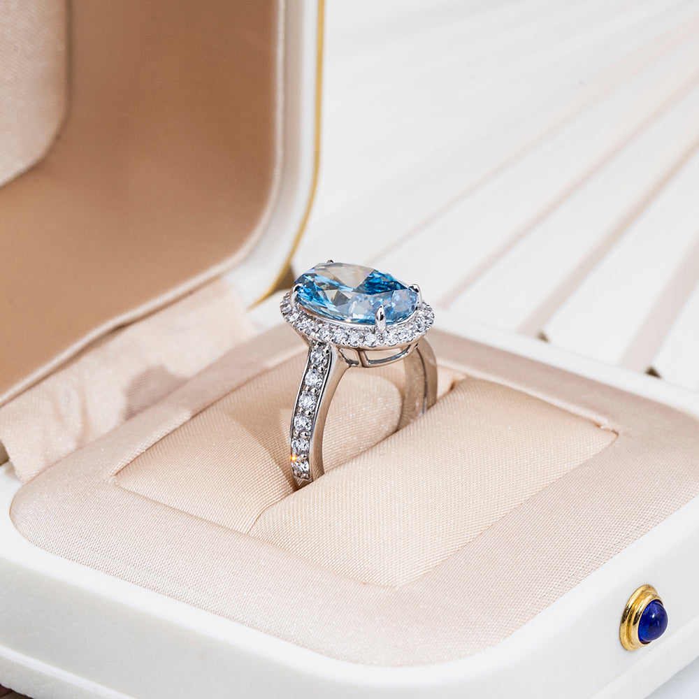 ブルーサファイアは何世紀にもわたり、知恵、忠誠、そして高貴さの象徴として大切にされてきました。光輪のデザインは永遠の愛と守護を、オーバルカットは永遠と継続を象徴しています。この2つの宝石が組み合わさることで、揺るぎない誓いと時を超えた献身を物語るリングが誕生します。