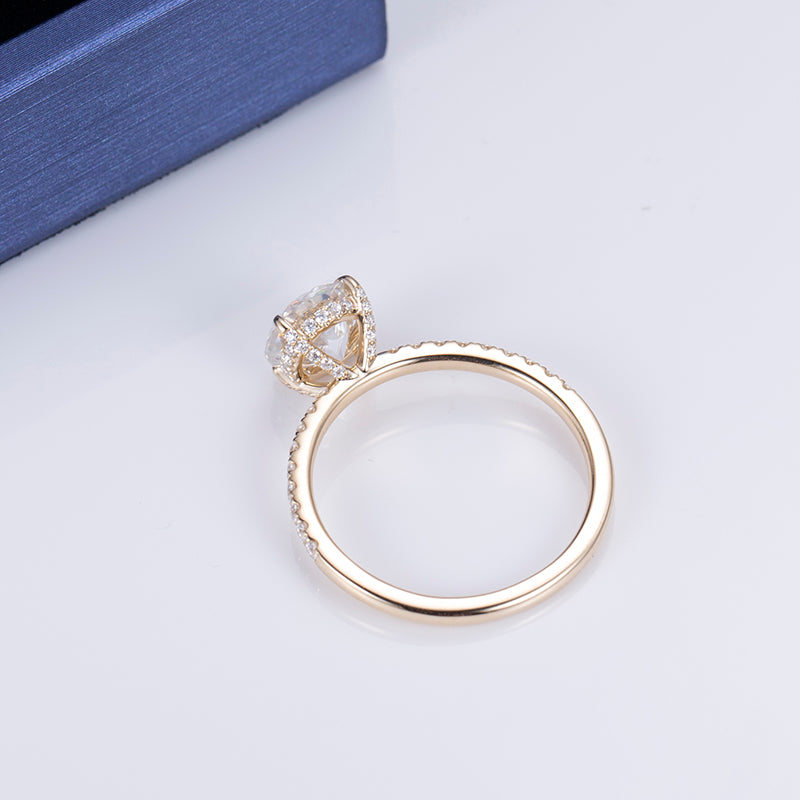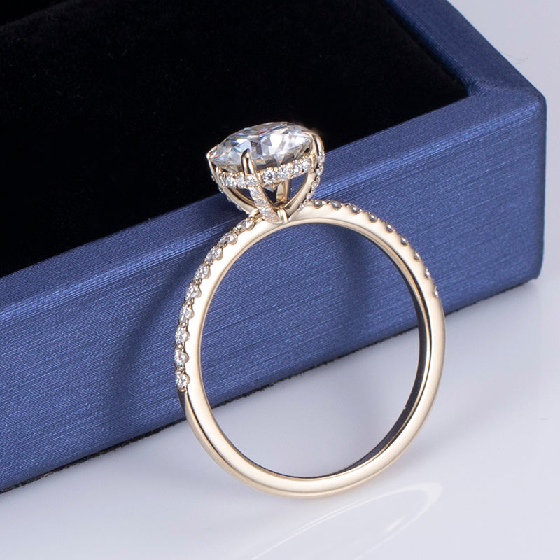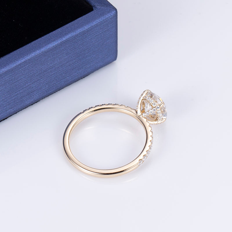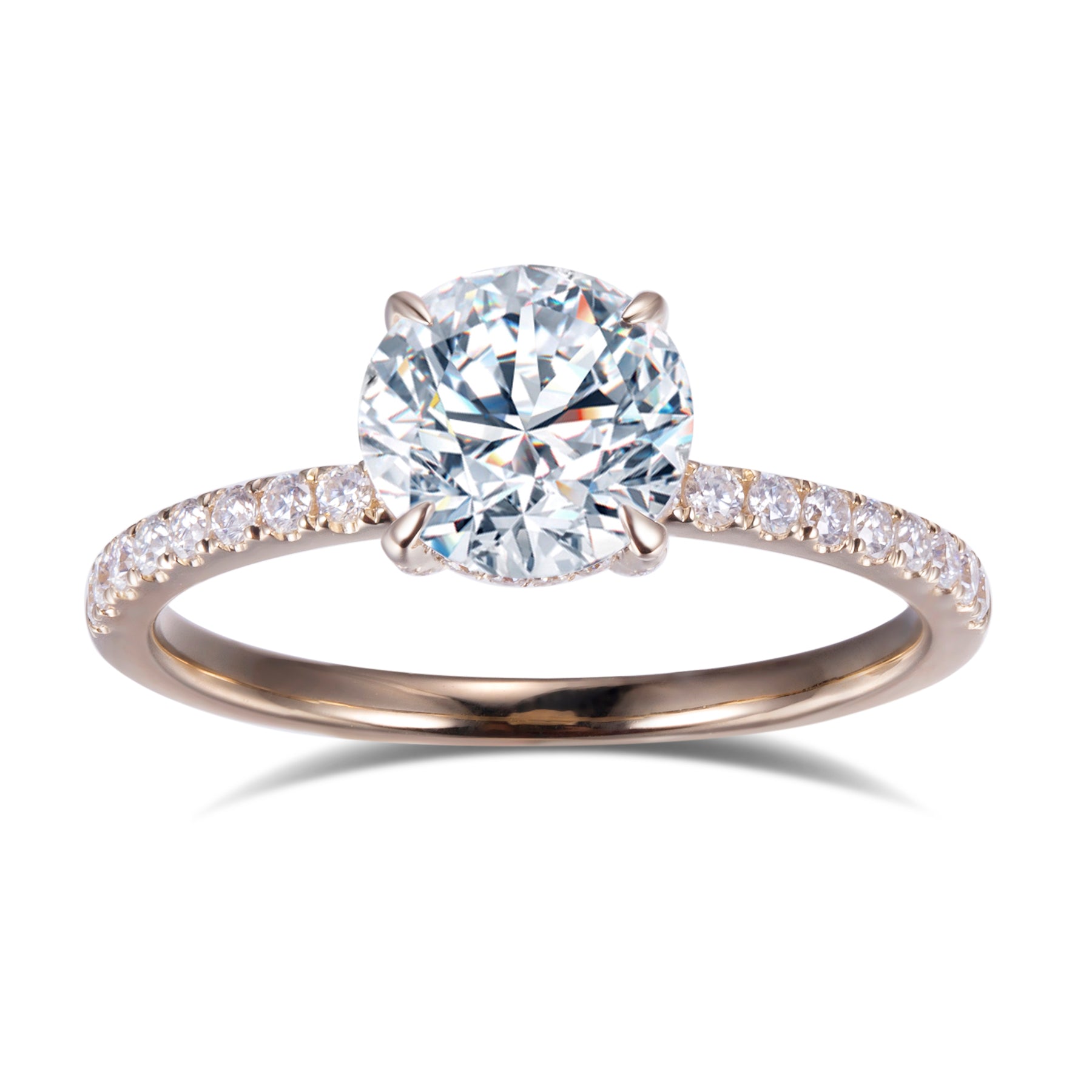 Eco-556 は、パヴェセッティングのバンドと 4 つの爪のセッティングが特徴の、18K イエロー ゴールドのクラシックなラウンド カットのラボ グロウン ダイヤモンドのエンゲージ リングで、ゴールドのトーンと輝く光を放つリングです。
