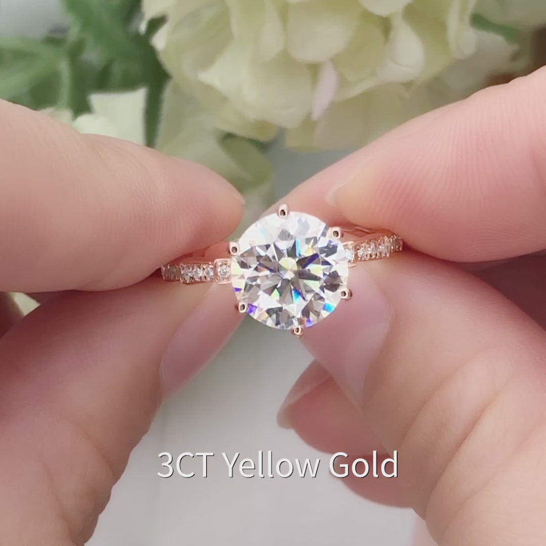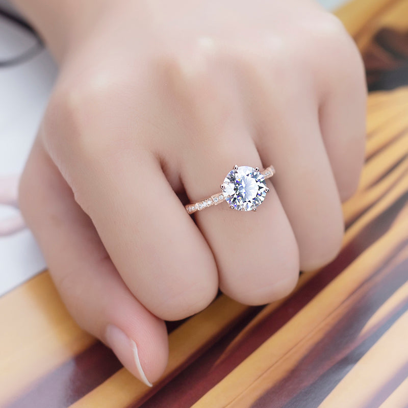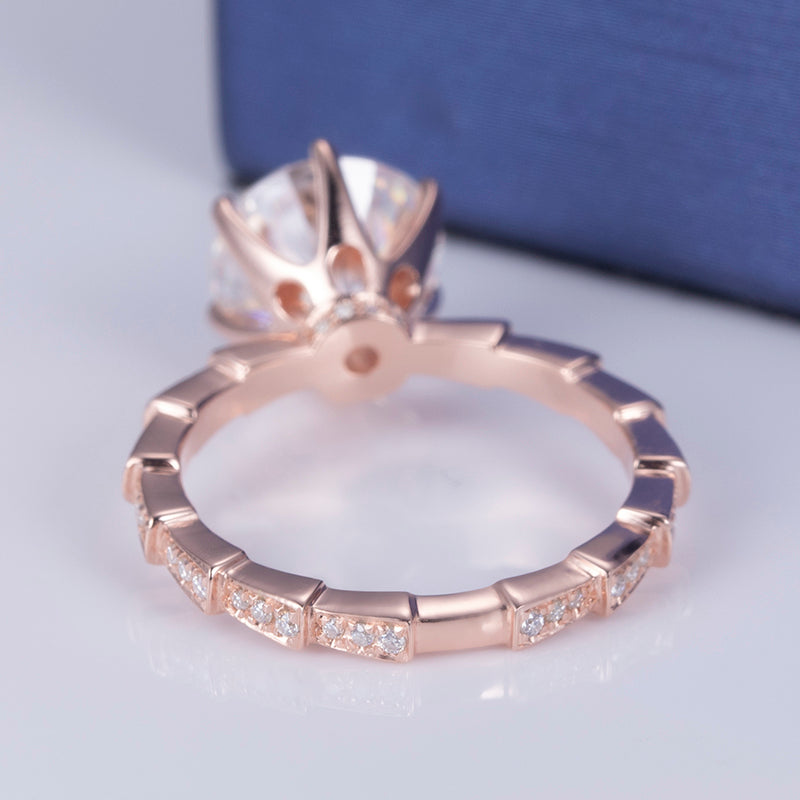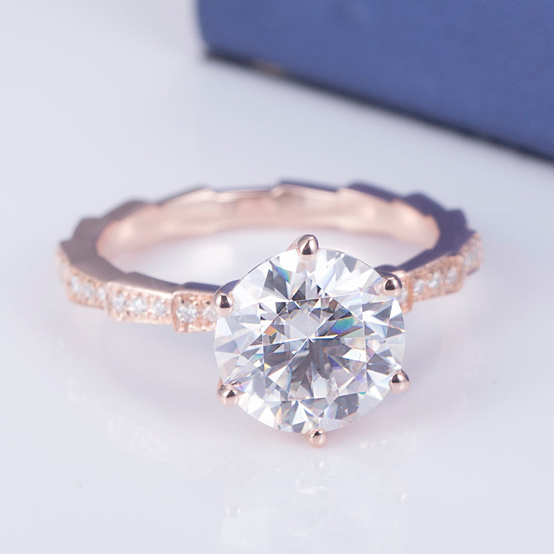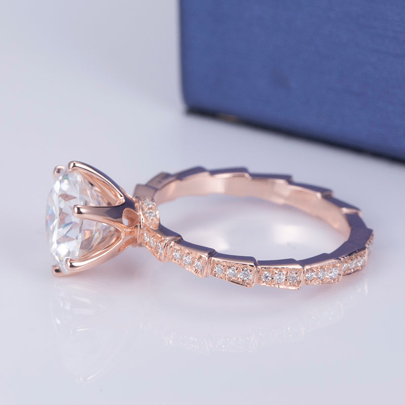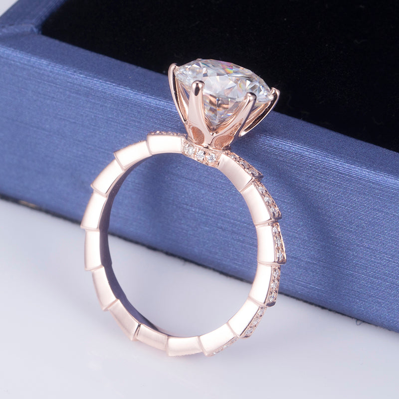 Eco-598 は、6 つの爪で留められたラボで生成されたラウンド ブリリアント ダイヤモンドと、階段状のパヴェ バンドが特徴のローズ ゴールドのエンゲージ リングです。愛の旅路を称えるように彫刻された、輝きと温かみが増すリングです。
