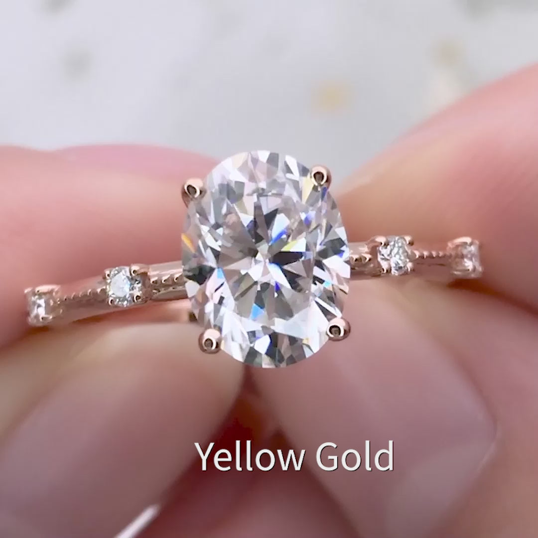 Eco-632 は、サイドアクセントが付いたラボで生成されたオーバルダイヤモンドを特徴とする 18K ゴールド製のローズゴールドのエンゲージリングです。対称性の優雅さとローズゴールドの温かみを彫刻的な抱擁の中に捉えたリングです。