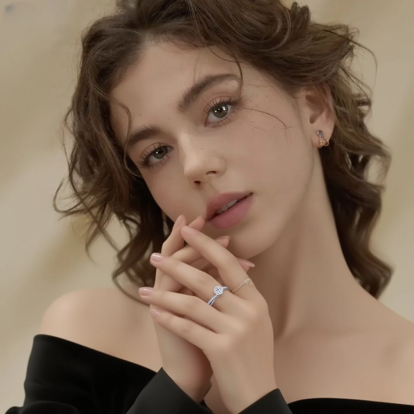 Eco-650 は、ラボで生成されたラウンドブリリアント ダイヤモンドを 6 つの爪で留め、パヴェをアクセントにした 18K ホワイト ゴールドのツイスト バンドをあしらったクラシックなソリティア エンゲージ リングです。時代を超越した生き生きとしたデザインで、静かな誓いの輝きを表現したリングです。