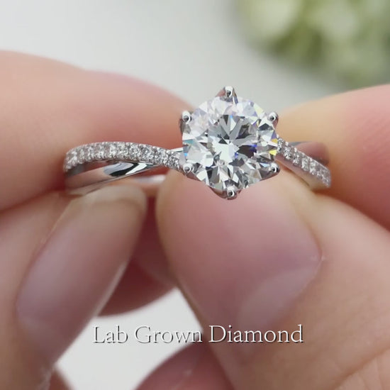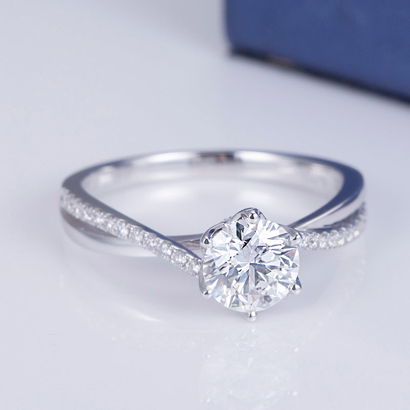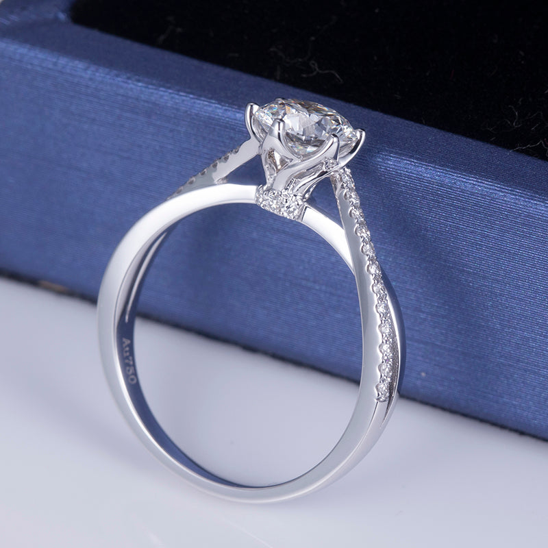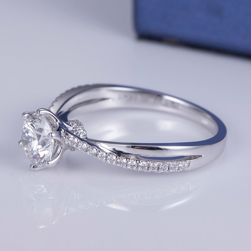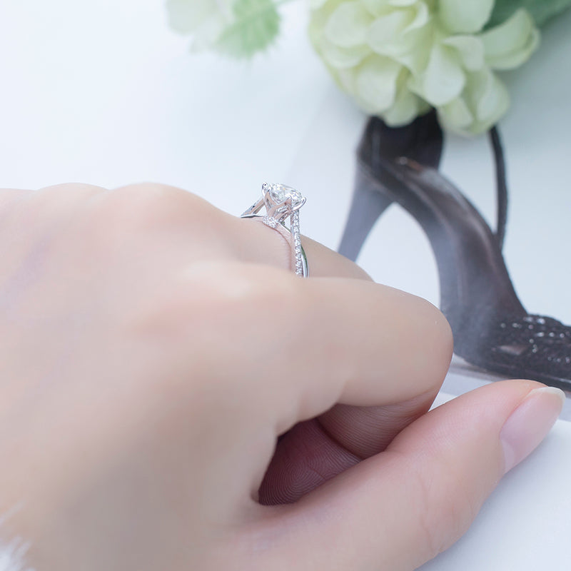 中央には、約1.0カラットのラボグロウン・ラウンドブリリアントダイヤモンドが6本爪で留められ、石の輝きを最大限に引き出しています。58面体のラウンドカットは、その対称性と輝きで高く評価されており、永遠の愛を象徴する最も象徴的な選択肢となっています。