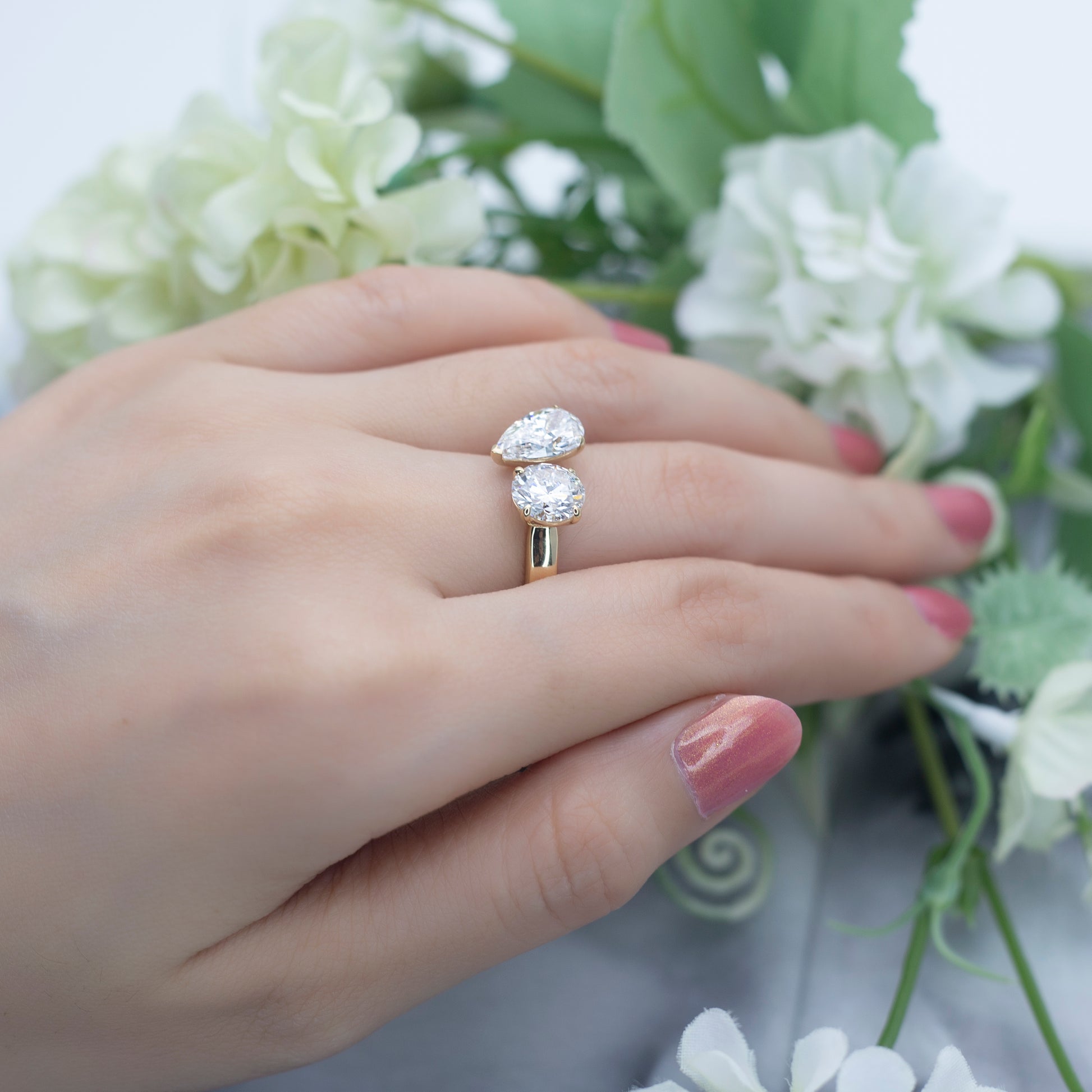 ペアシェイプカットは流動性と優雅さを、ラウンドシェイプカットはシンメトリーと輝きを放ち、動きとバランスの視覚的な対話を生み出します。石は、18Kイエローゴールド製のバイパススタイルのバンドにセットされ、温かみのある鏡面仕上げが施されています。