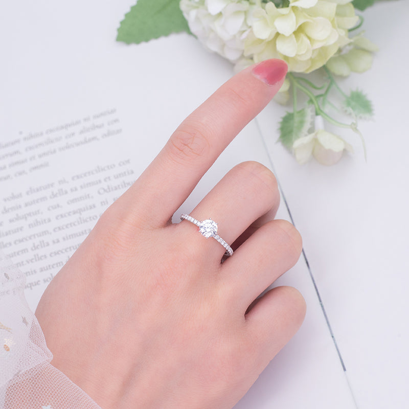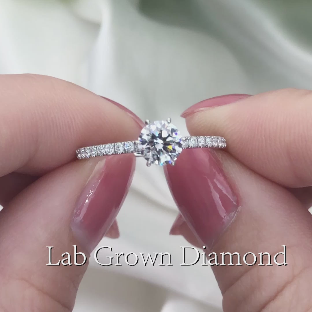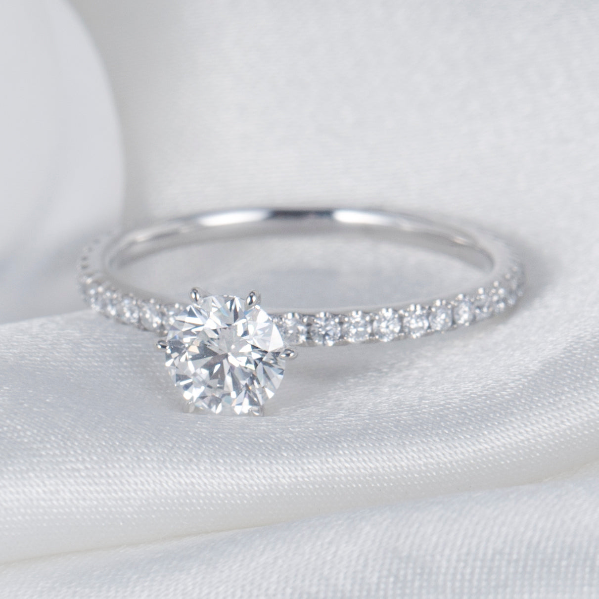 58面体のラウンドカットは、その対称性と輝きで高く評価されており、永遠の愛を象徴する最も象徴的な選択肢となっています。18Kホワイトゴールド製のリングは、鏡面仕上げに磨き上げられ、シャンクの半周に渡ってパヴェセッティングされたラボグロウンラウンドダイヤモンドがあしらわれています。