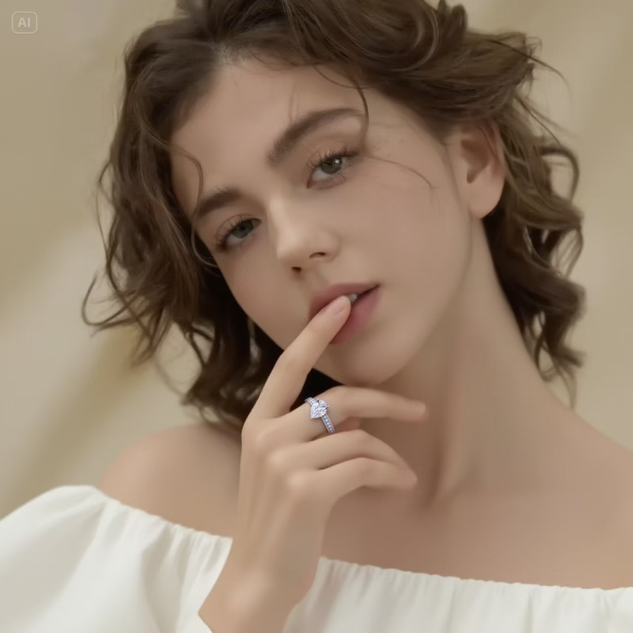 Eco-727 は単なる指輪ではありません。涙滴型の光、透明感を約束する彫刻、そして地球と心の両方を尊重する愛の輝かしい祝福です。