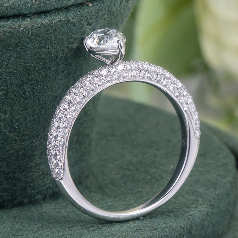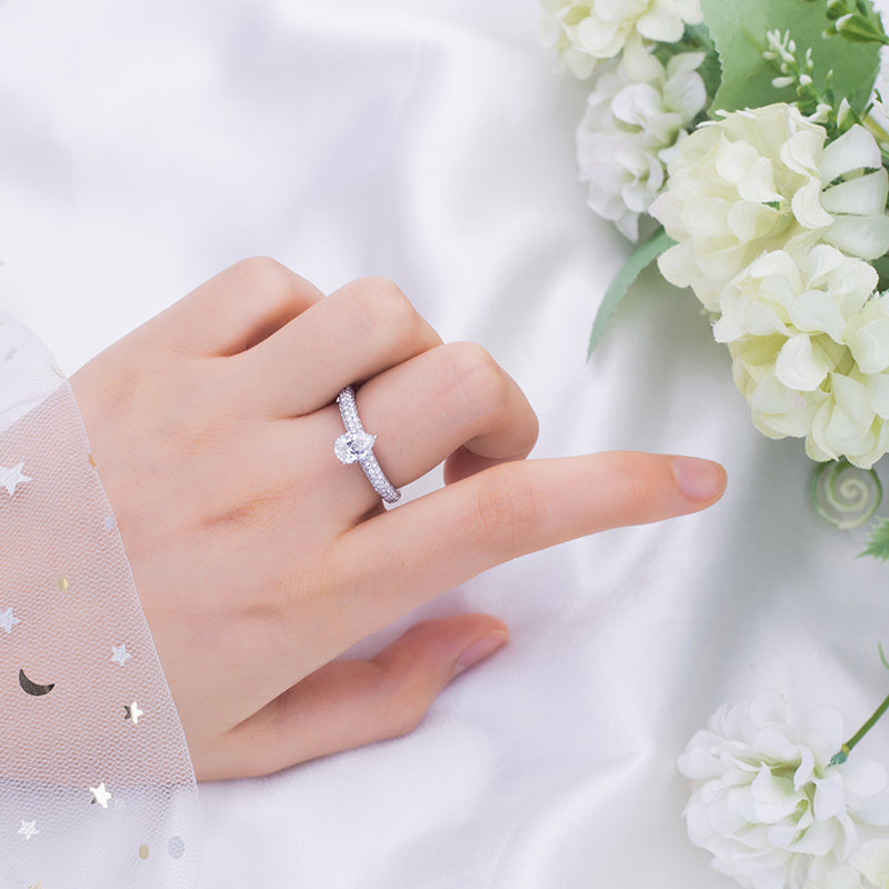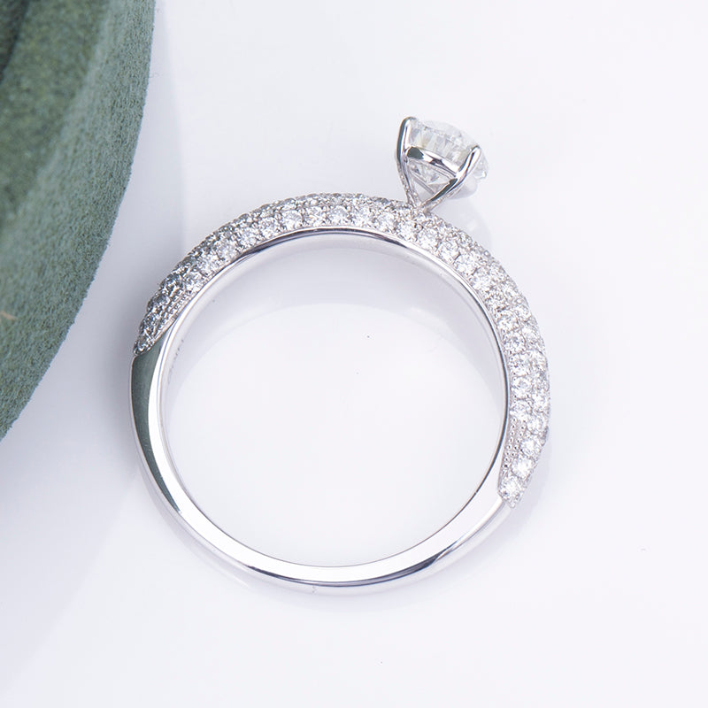これらのアクセントストーンは、中央のダイヤモンドの輝きを際立たせながら、洗練されたバランスのとれたシルエットを保ちながら、連続したきらめきを生み出します。セッティングの高さは、快適さと視認性を最大限に高め、普段使いにも、セレモニーシーンにも最適です。