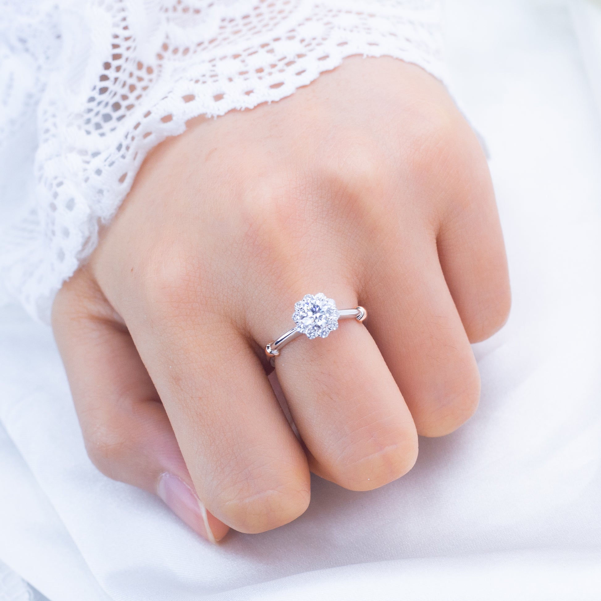 Eco-740は、貴金属に彫刻された輝く花です。自然の詩情と倫理的な職人技の精緻さを捉えたリングです。中央には、ラボで育成されたラウンドブリリアントカットのダイヤモンドが4本爪で留められ、その周囲を小さなラボで育成されたダイヤモンドが花をイメージしたハローで囲んでいます。