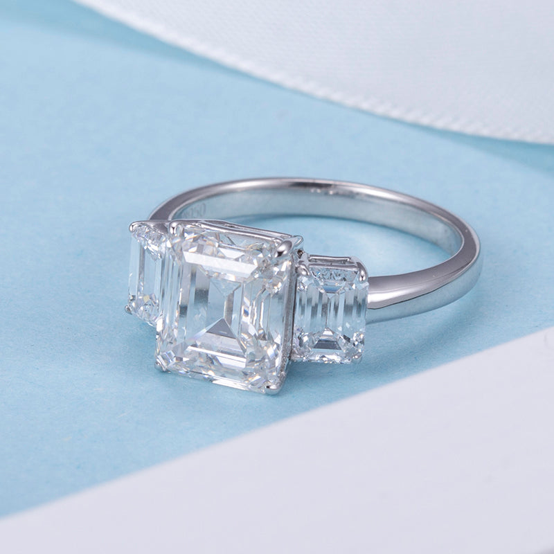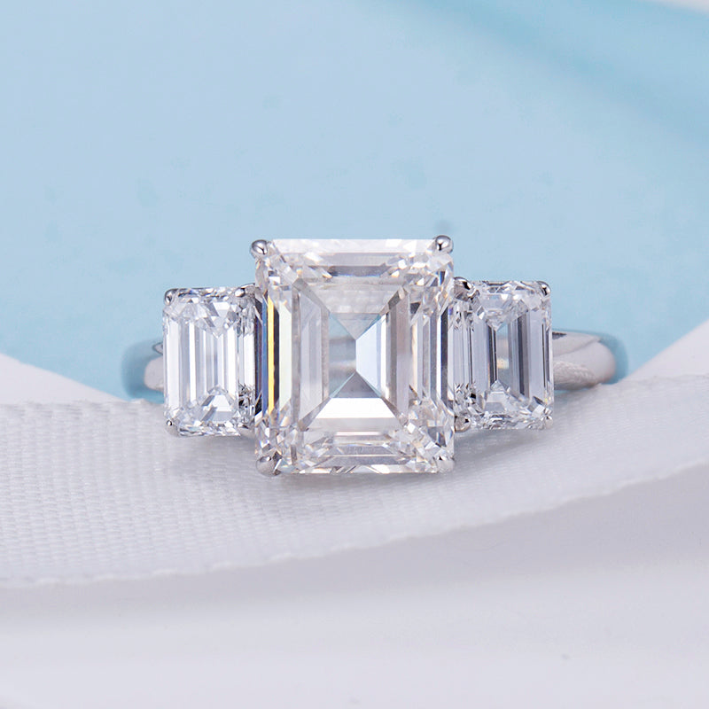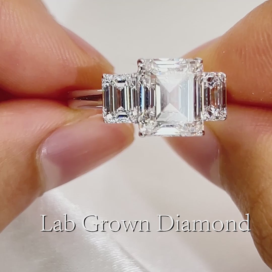 Eco-741: リニア グレース – ラボグロウン エメラルドカット スリーストーン リング(18Kホワイトゴールド)