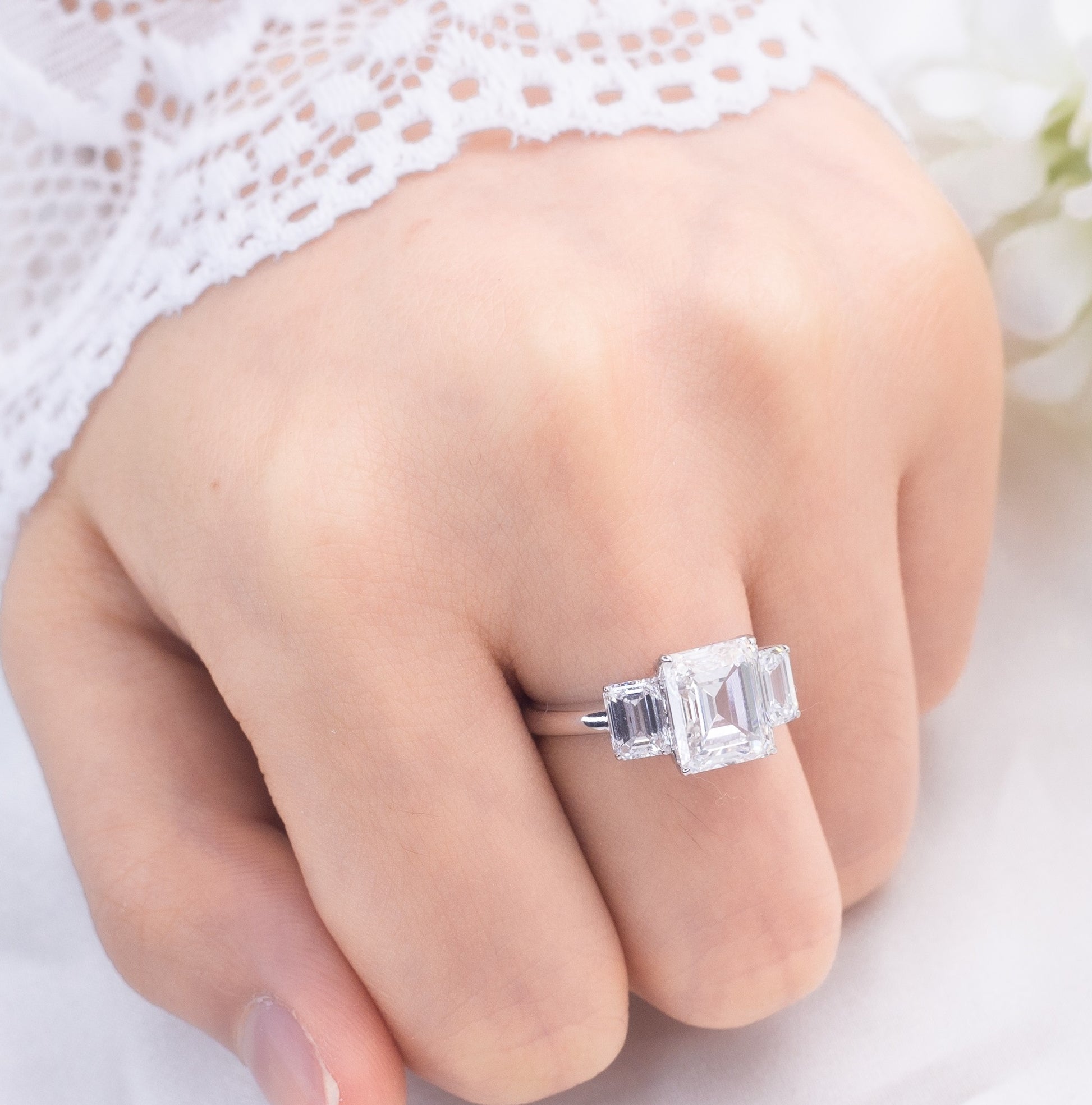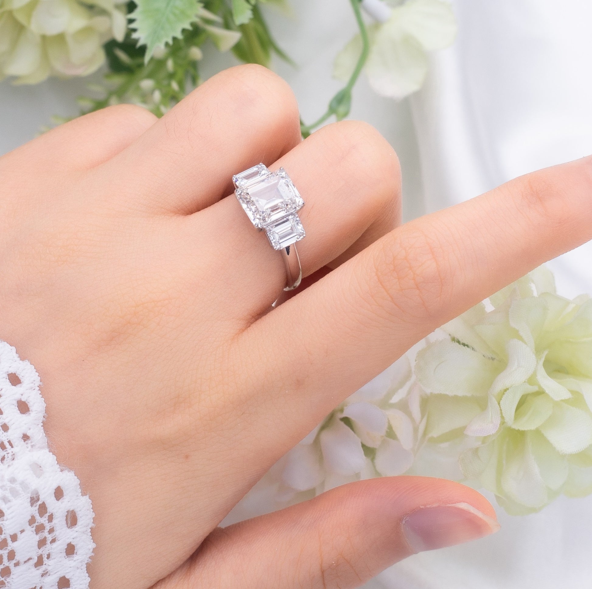 建築的なエレガンスと鏡のような反射で知られるエメラルドカットは、時代を超えた洗練さと現代的な抑制を想起させます。センターストーンの両脇には、それぞれわずかに小さめながらも同等の輝きを放つ2つのエメラルドカットダイヤモンドがあしらわれ、過去、現在、そして未来を象徴する調和のとれたトリオを創り出しています。