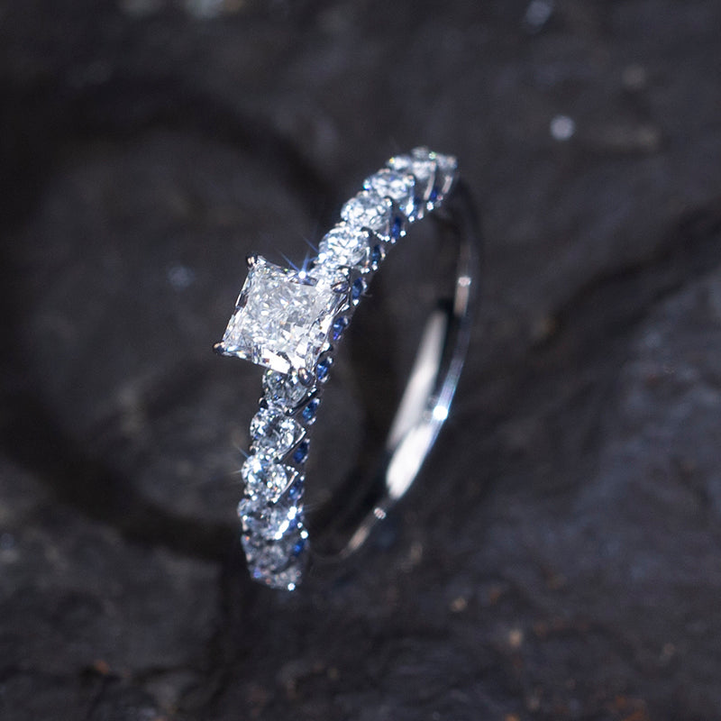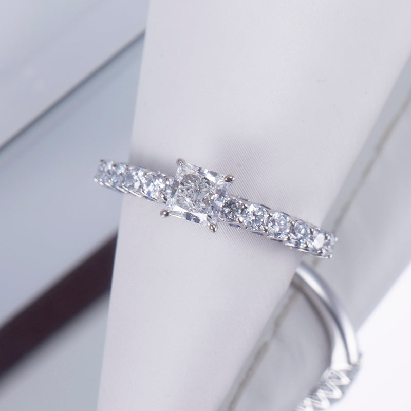 Eco-809は、シンメトリーと輝きを称えるリング。建築的な精密さと詩的なきらめきが絶妙に調和しています。中央には、ラボで育成されたプリンセスカットダイヤモンドが4本爪でセッティングされ、スクエアシルエットを高貴な透明感で引き立てています。