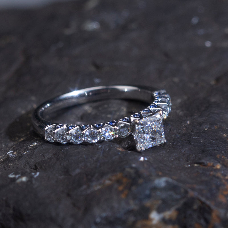 シャープな角度と輝きを放つファセットで知られるプリンセスカットは、クラシックなラウンドカットに代わるモダンな選択肢として、大胆なエレガンスを求める方に最適です。18Kホワイトゴールドを彫刻のように加工し、鏡面仕上げに磨き上げられたリングには、シャンクの半周に渡るシェアプロングパヴェセッティングで、ラボグロウンのラウンドブリリアントダイヤモンドがあしらわれています。