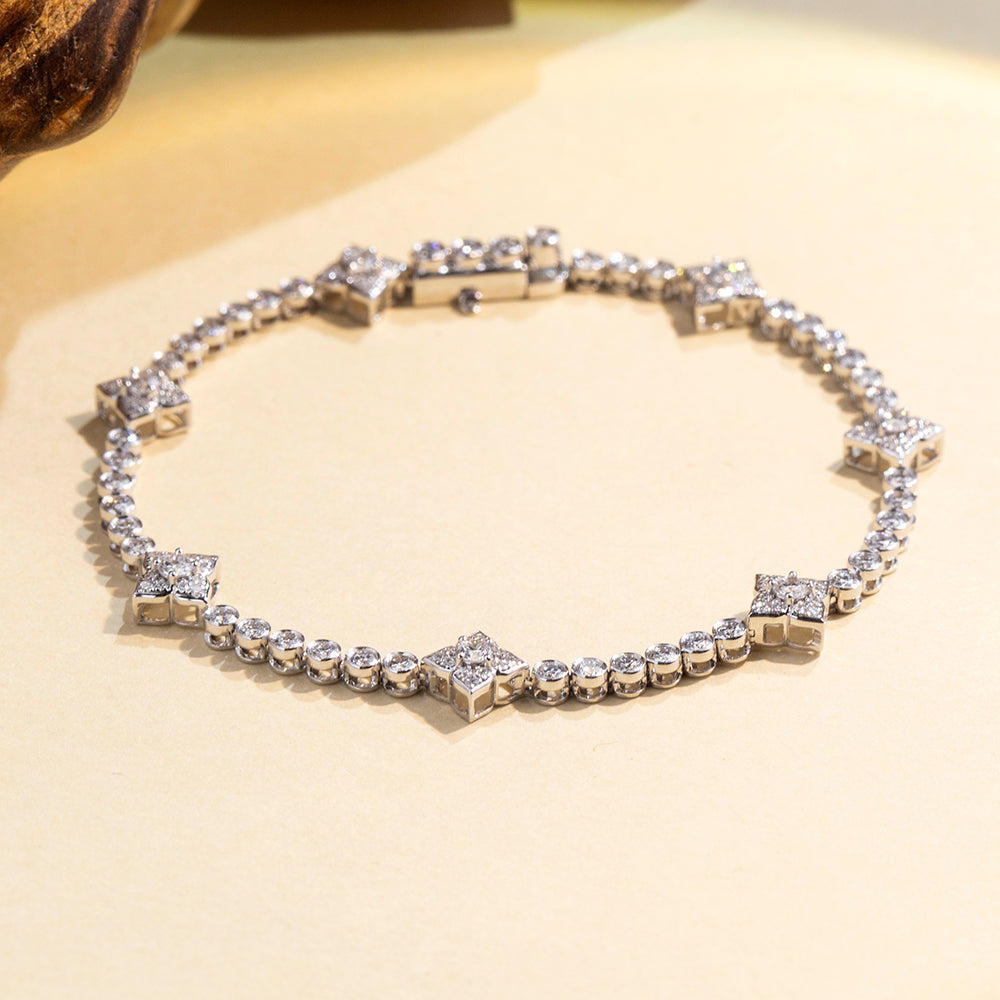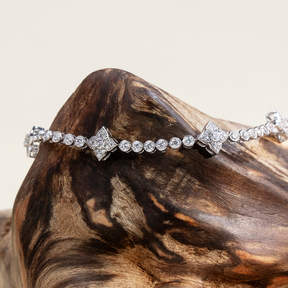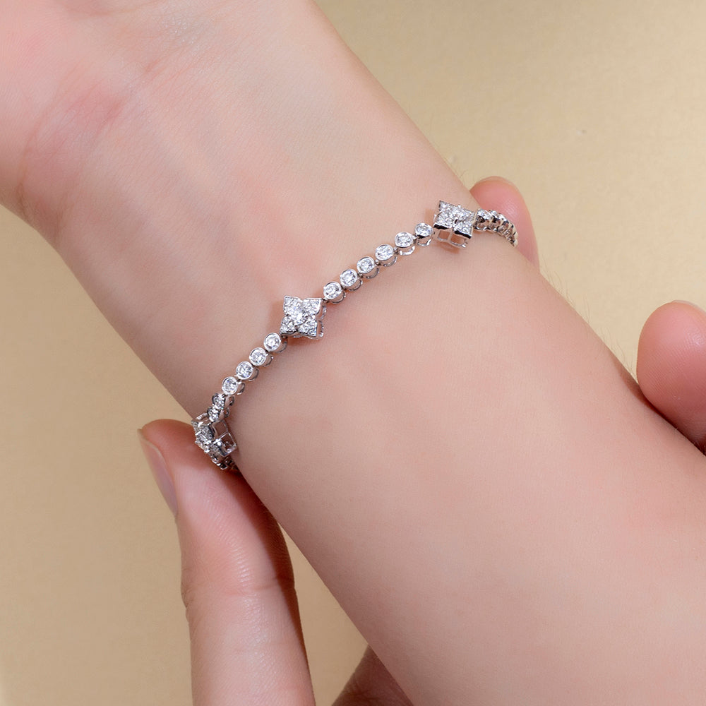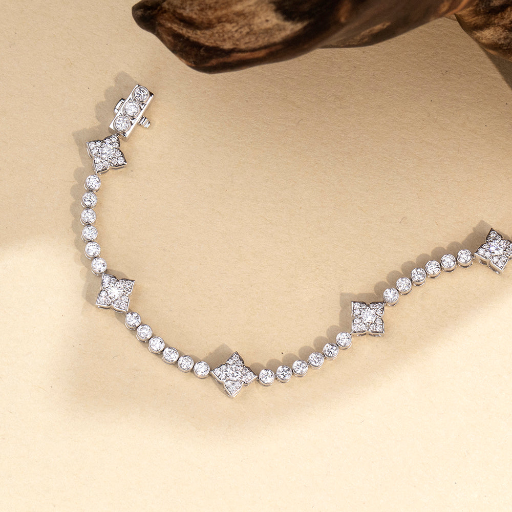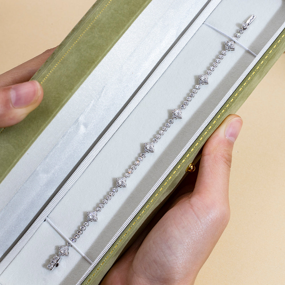 18Kホワイトゴールドで仕立てられたこのブレスレットは、ラウンドカットのラボグロウンダイヤモンドを直線的に配置したデザインで、その間にスクエア型のダイヤモンドクラスターが散りばめられています。それぞれのスクエアセッティングには複数のマイクロパヴェダイヤモンドがセッティングされ、ピラミッドのような輝きを放ちます。ラウンドカットのダイヤモンドの滑らかな輝きと美しいコントラストが織りなすこの交互に並ぶパターンは、オートクチュールのディテールや時代を超えたアールデコのモチーフを彷彿とさせる、リズミカルな視覚的流れを想起させます。