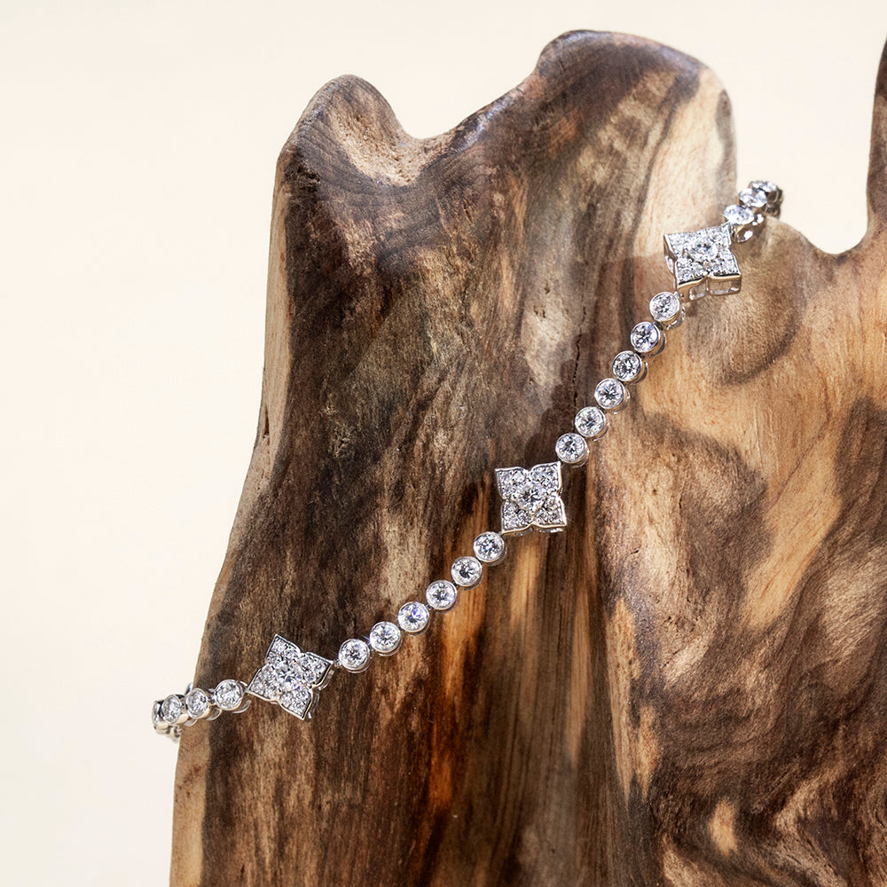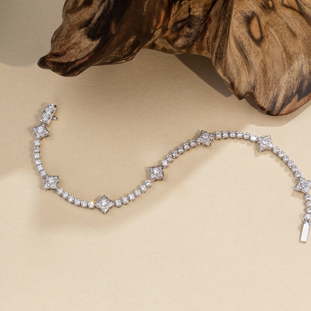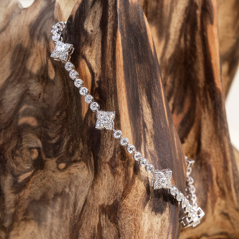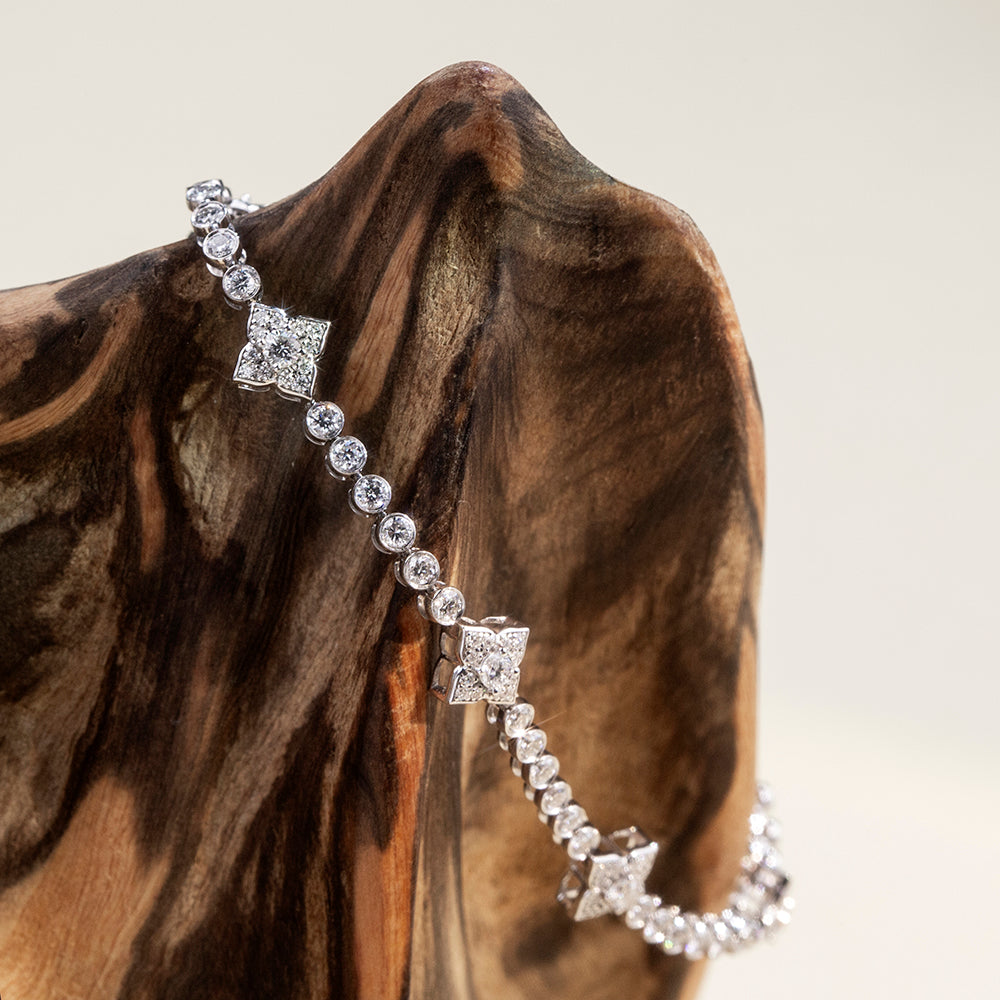 18Kホワイトゴールドで仕立てられたこのブレスレットは、ラウンドカットのラボグロウンダイヤモンドを直線的に配置したデザインで、その間にスクエア型のダイヤモンドクラスターが散りばめられています。それぞれのスクエアセッティングには複数のマイクロパヴェダイヤモンドがセッティングされ、ピラミッドのような輝きを放ちます。ラウンドカットのダイヤモンドの滑らかな輝きと美しいコントラストが織りなすこの交互に並ぶパターンは、オートクチュールのディテールや時代を超えたアールデコのモチーフを彷彿とさせる、リズミカルな視覚的流れを想起させます。