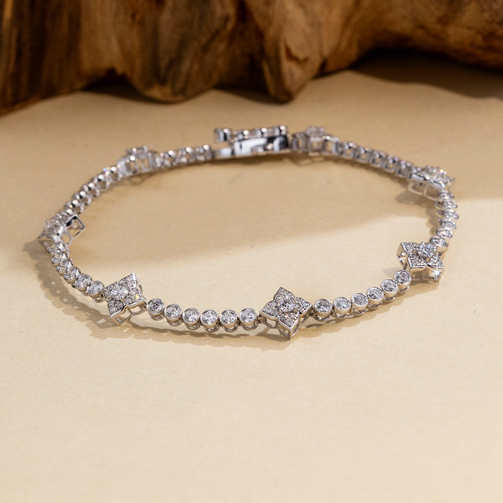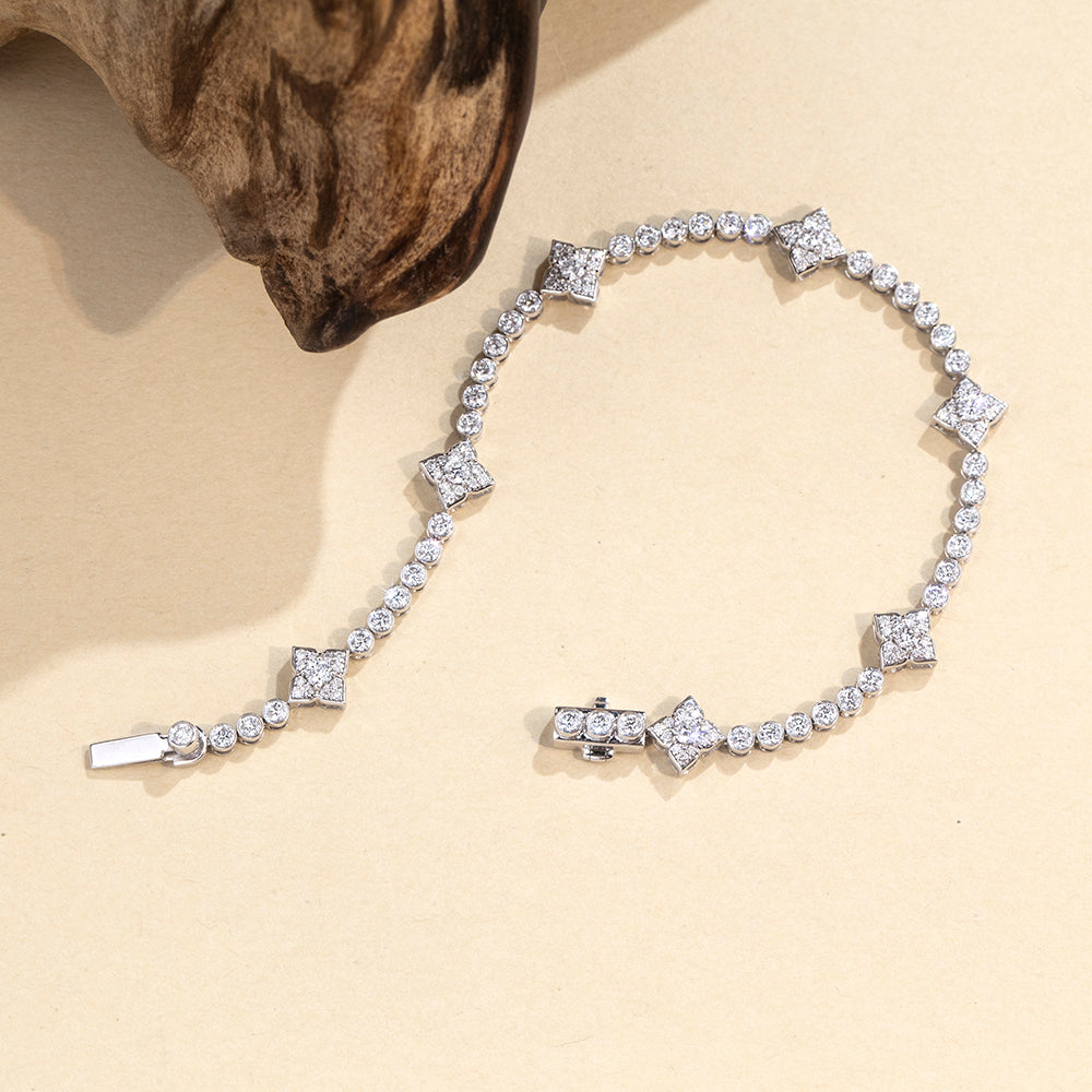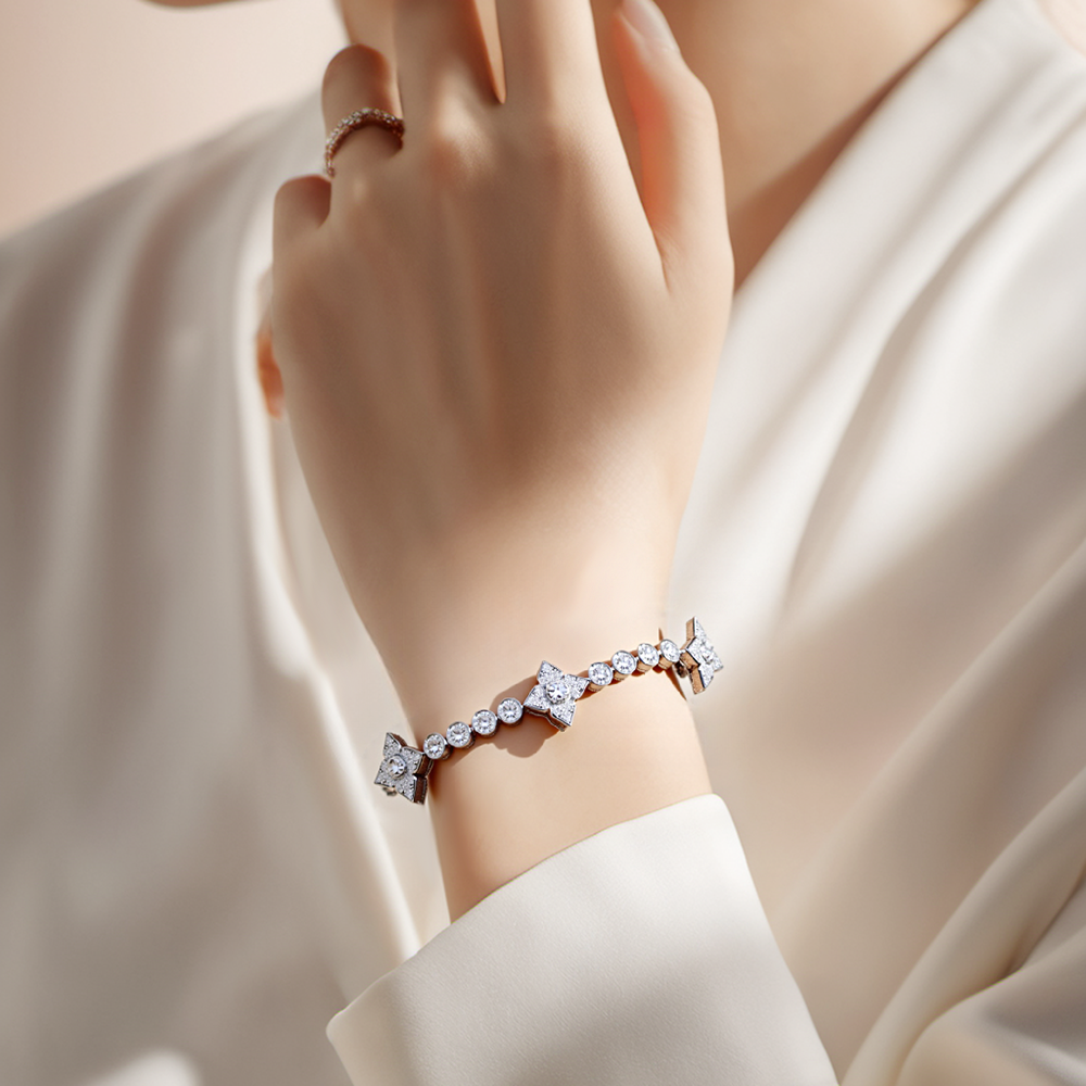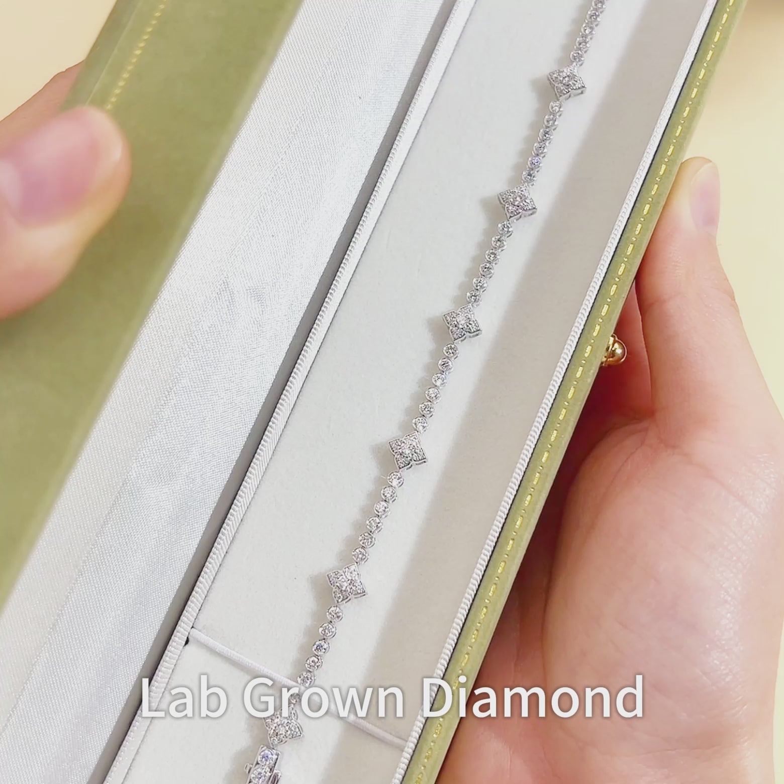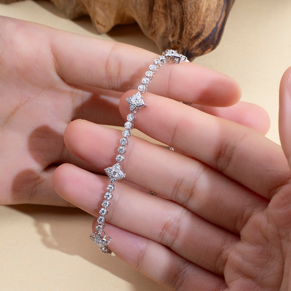 18Kホワイトゴールドで仕立てられたこのブレスレットは、ラウンドカットのラボグロウンダイヤモンドを直線的に配置したデザインで、その間にスクエア型のダイヤモンドクラスターが散りばめられています。それぞれのスクエアセッティングには複数のマイクロパヴェダイヤモンドがセッティングされ、ピラミッドのような輝きを放ちます。ラウンドカットのダイヤモンドの滑らかな輝きと美しいコントラストが織りなすこの交互に並ぶパターンは、オートクチュールのディテールや時代を超えたアールデコのモチーフを彷彿とさせる、リズミカルな視覚的流れを想起させます。