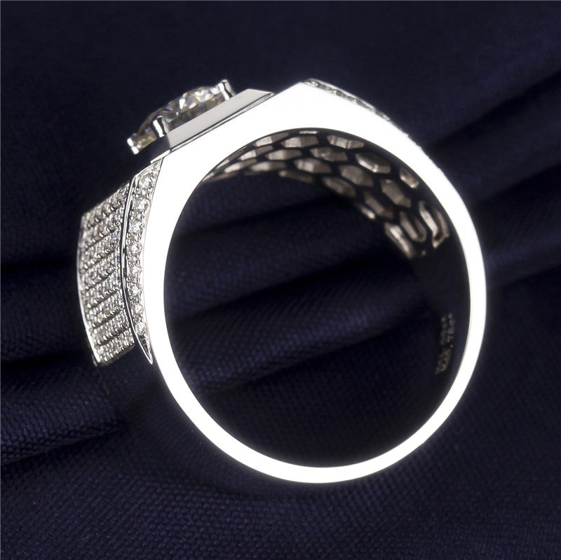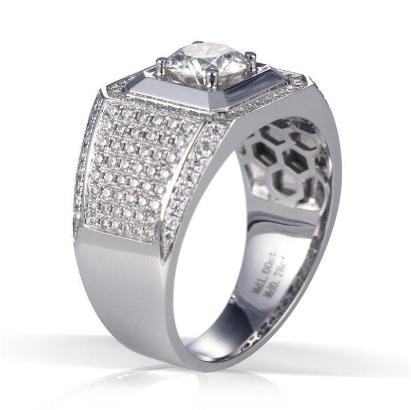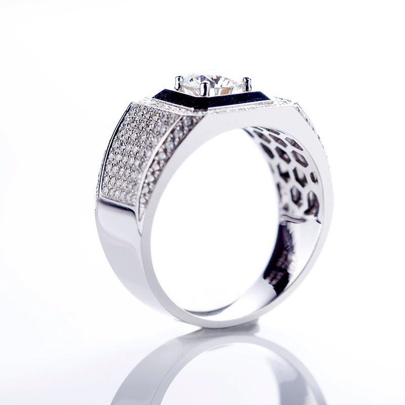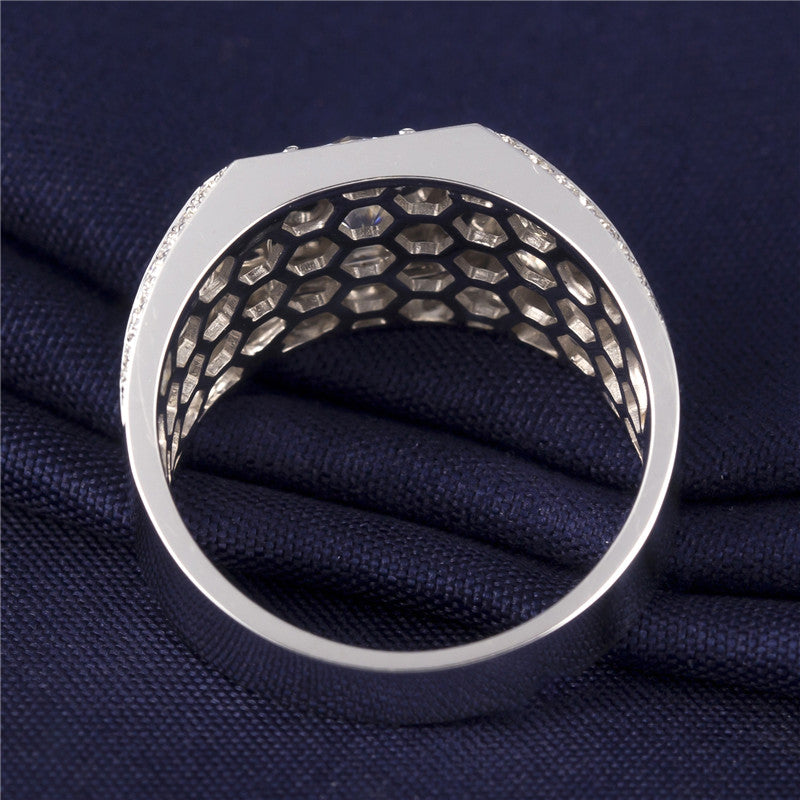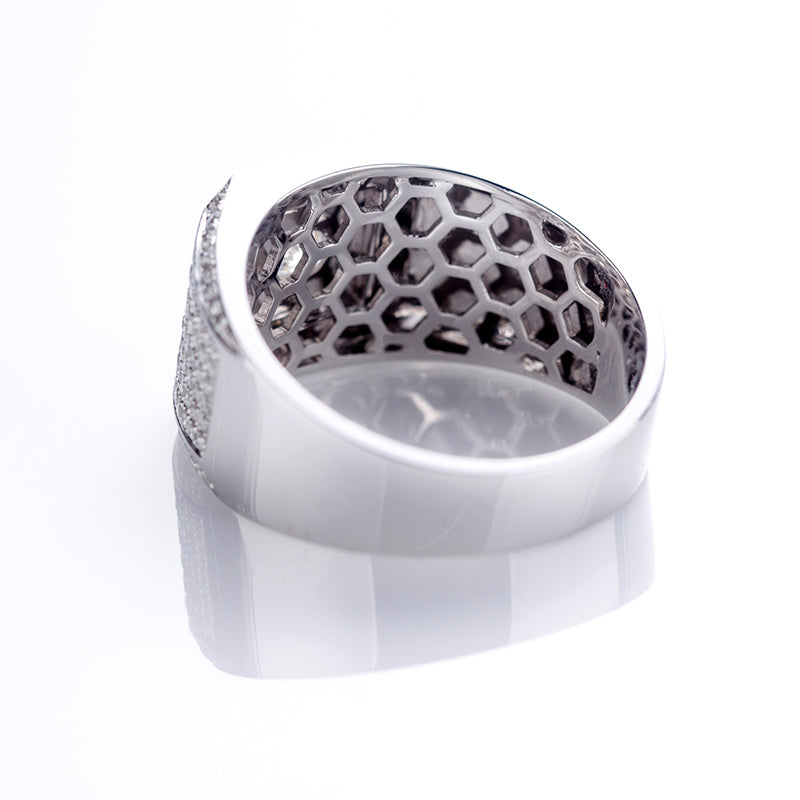 合計約1.5カラットのアクセントストーンが、あらゆる角度から光を反射する輝く表面を作り出します。内側のバンドには装飾的なハニカムパターンが施され、職人技の輝きと通気性を高め、快適な着け心地を実現しています。