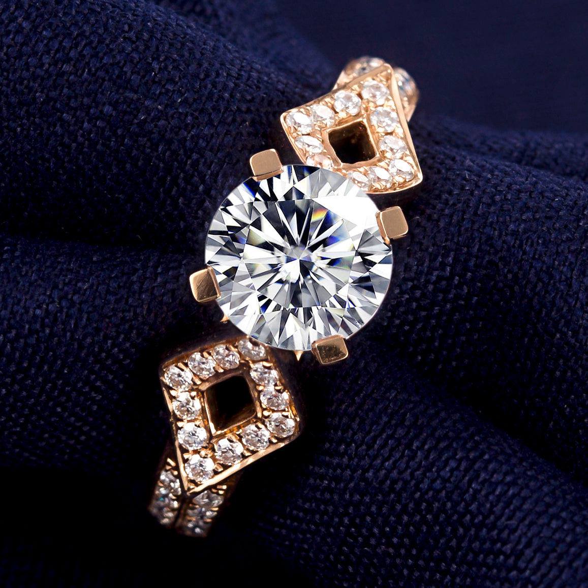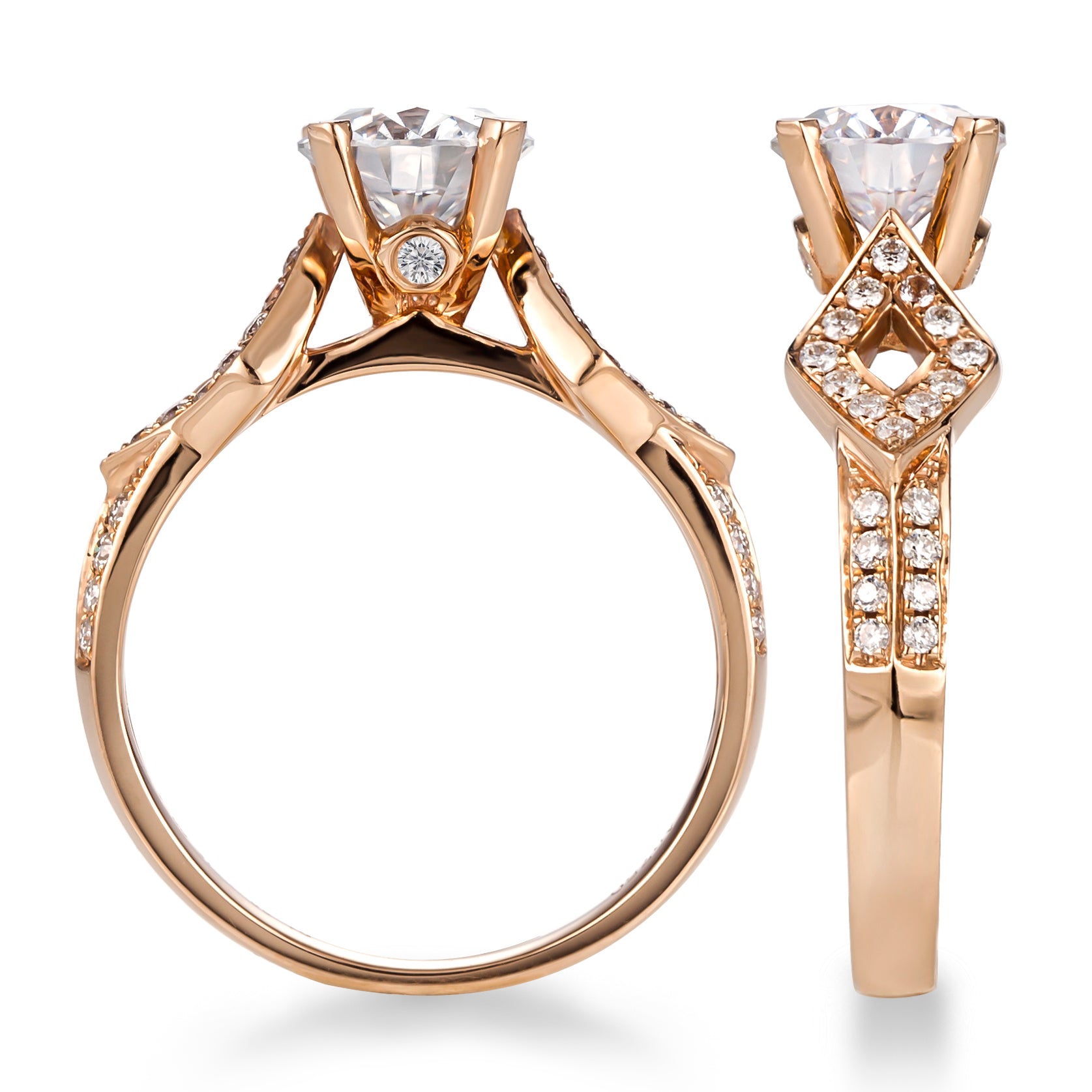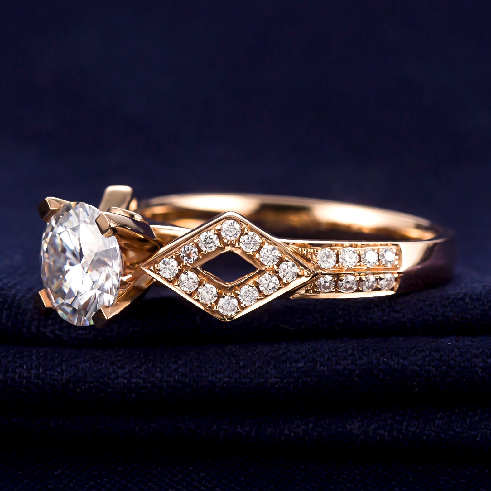 Flanking the center stone are two diamond-shaped frames, each adorned with pavé-set lab-grown diamonds, forming a symmetrical crossroads motif. A bezel-set diamond sits nestled beneath the prongs, adding a hidden sparkle—like a secret vow held close. The 18K gold band, warm and polished, tapers gently to balance the ornate setting with graceful simplicity.