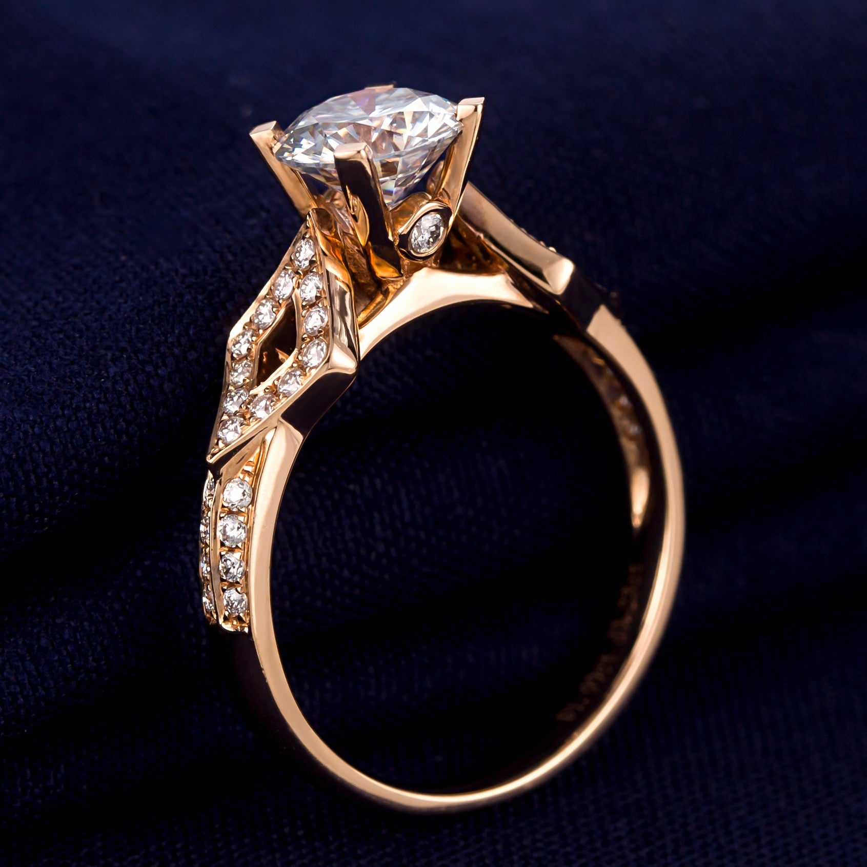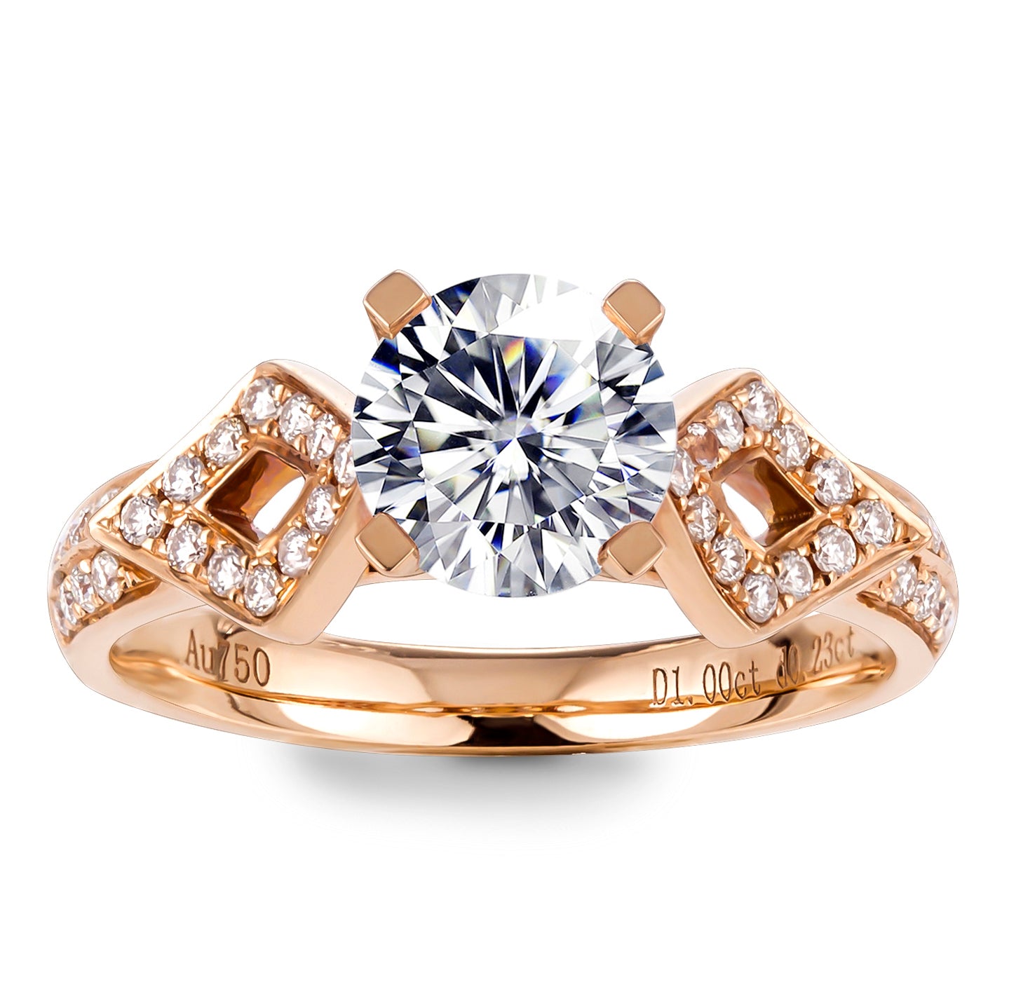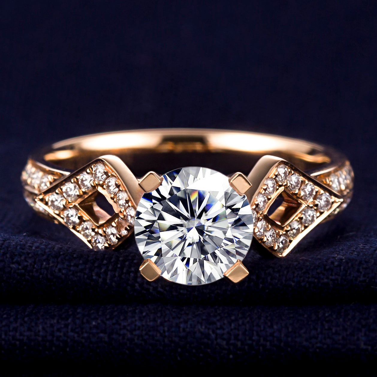 Flanking the center stone are two diamond-shaped frames, each adorned with pavé-set lab-grown diamonds, forming a symmetrical crossroads motif. A bezel-set diamond sits nestled beneath the prongs, adding a hidden sparkle—like a secret vow held close. The 18K gold band, warm and polished, tapers gently to balance the ornate setting with graceful simplicity.
