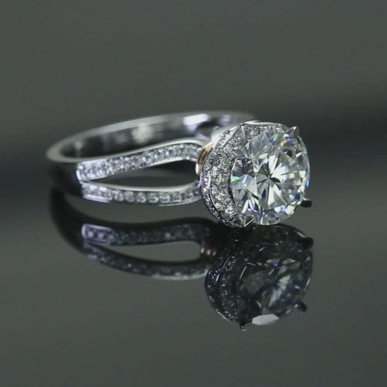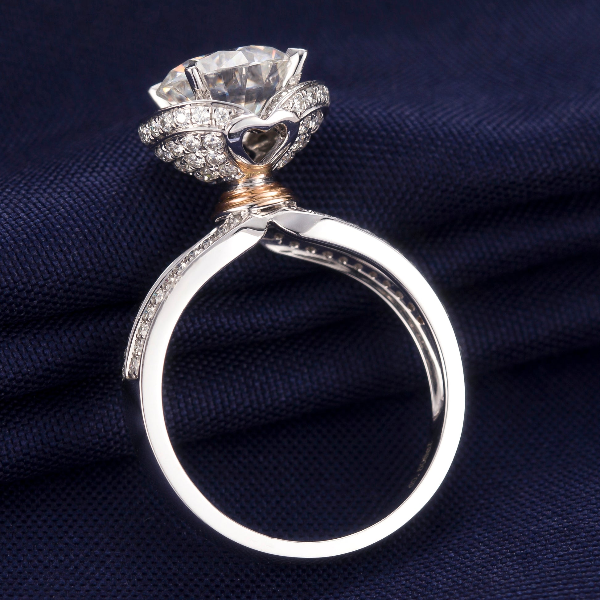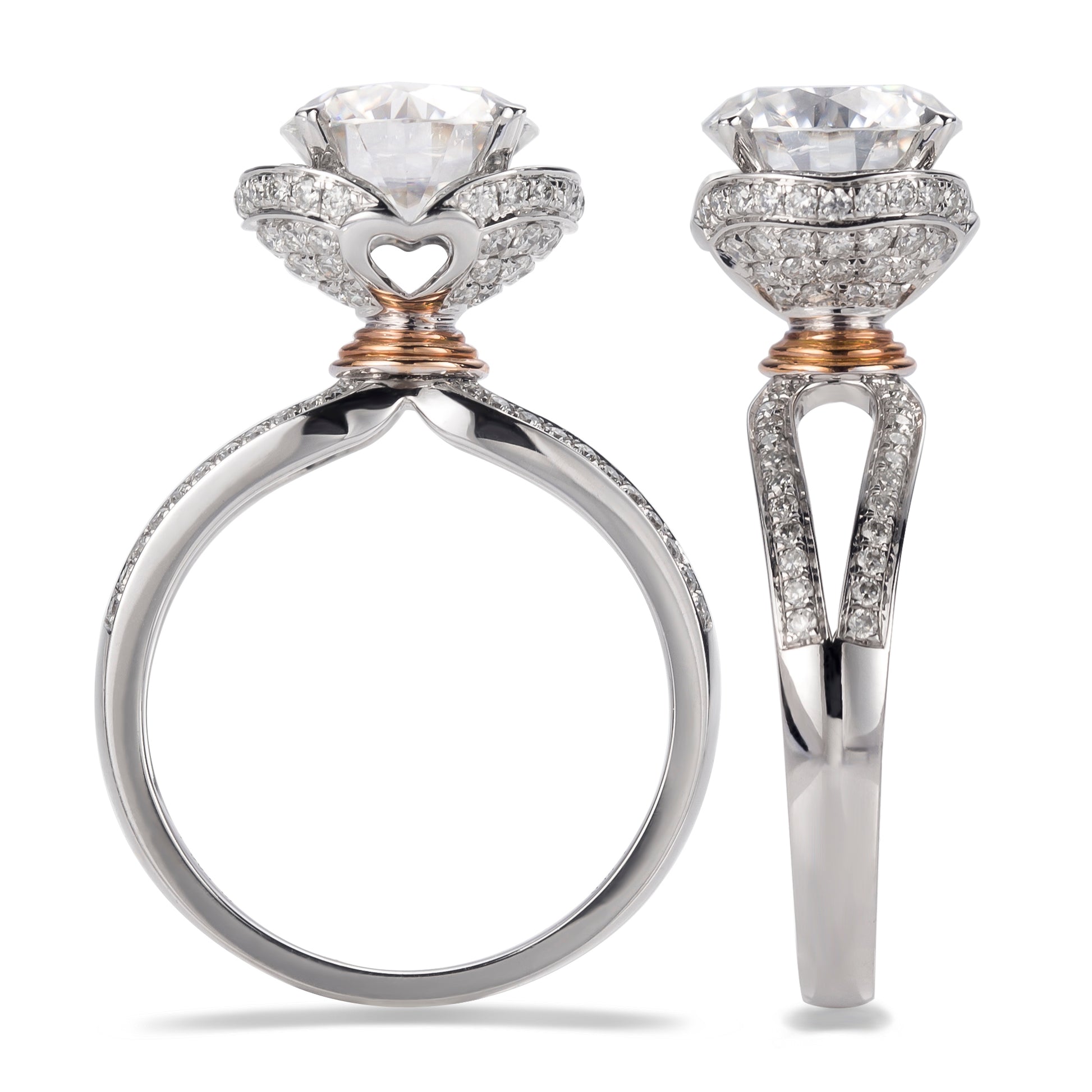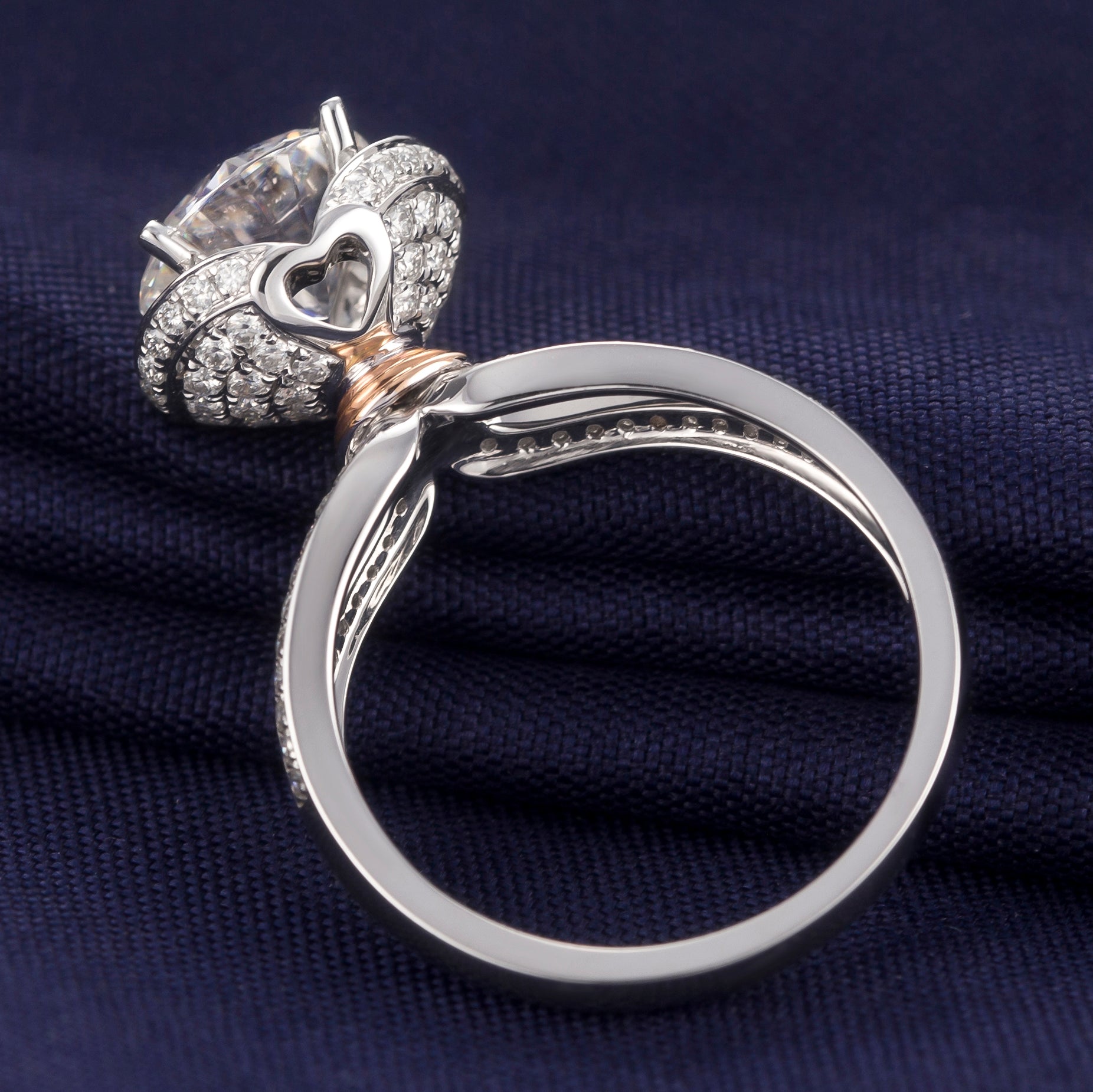 The split shank band, crafted in polished 18K white gold, twists upward in a sculptural embrace, adorned with twin rows of pave-set diamonds. Beneath the halo, a hidden heart-shaped accent in 18K rose gold adds warmth and intimacy—an elegant secret only the wearer knows.