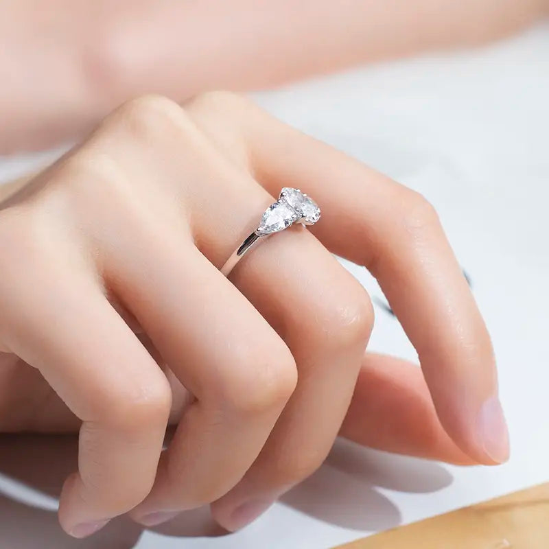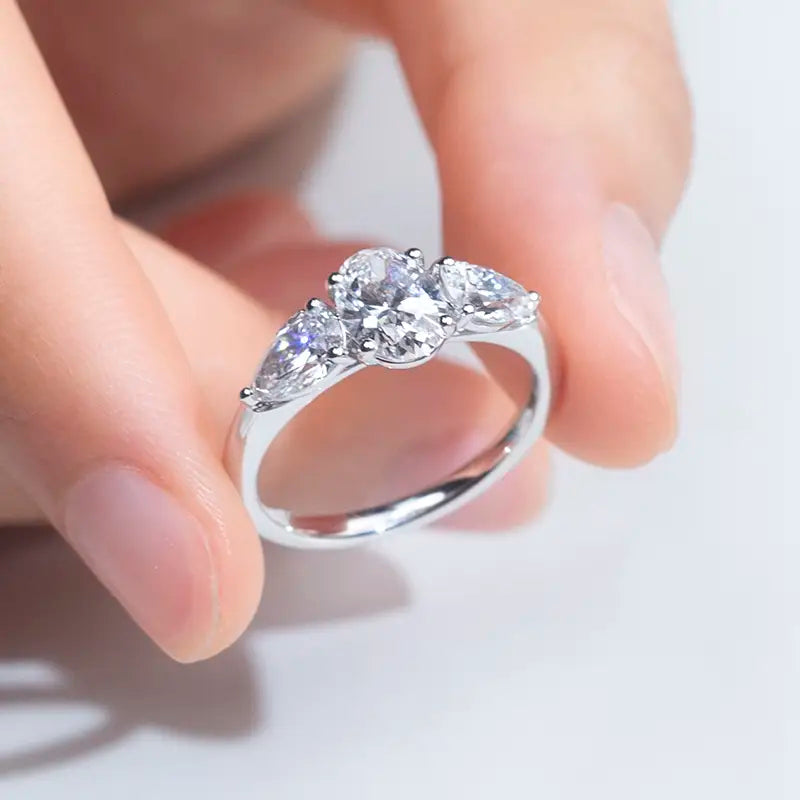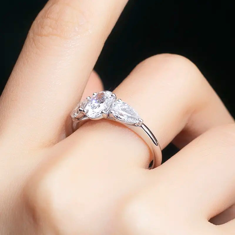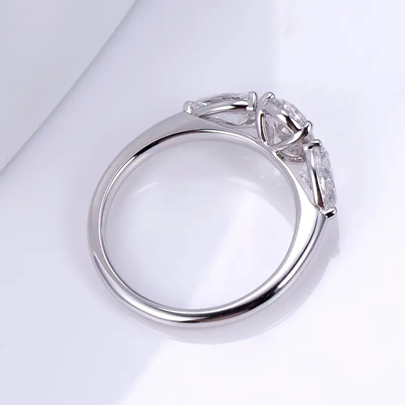 Flanked by two pear-shaped lab-grown diamonds, the three-stone design represents the journey of love—past, present, and future. The center stone is held in a refined four-prong basket, crafted in luminous 18K white gold, and elevated just enough to catch candlelight while remaining perfectly stackable with a wedding band.