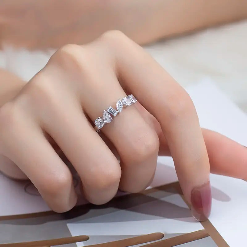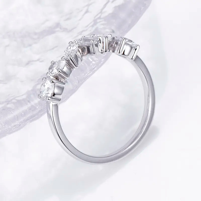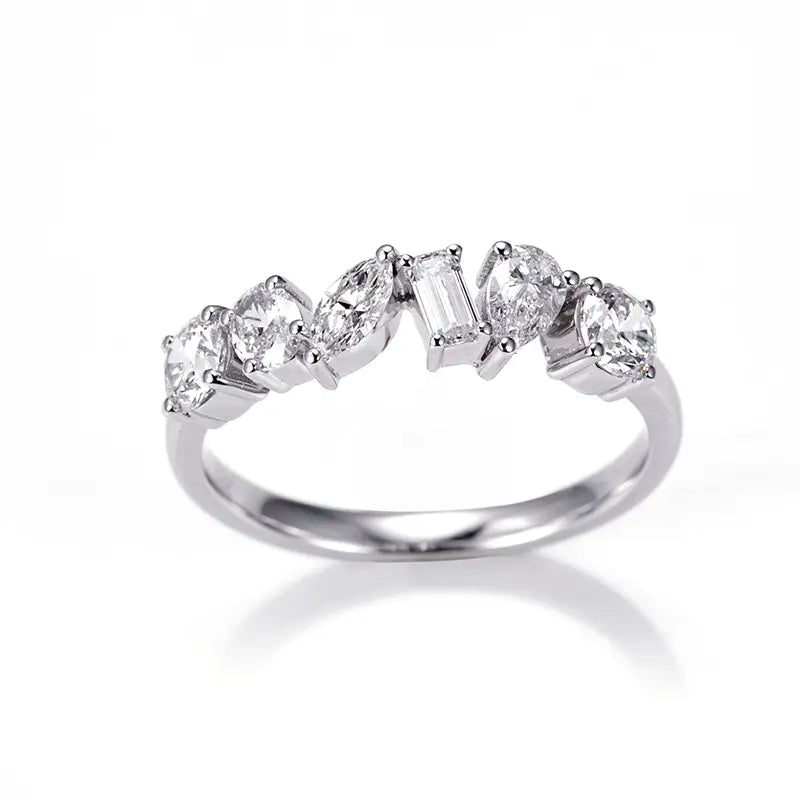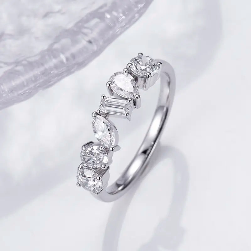 The Eco-1302 ring by Ecogemma is a celebration of eternal brilliance—crafted for those who believe luxury should reflect both beauty and values. This hall-style eternity ring features a continuous arc of fancy-shaped lab-grown diamonds, including round, marquise, oval, and baguette cuts, arranged in a graceful curve across the top of the band. Each stone is precision-grown using advanced CVD/HPHT technology, delivering the same fire, clarity, and durability as the world's finest mined diamonds—without the environmental toll.