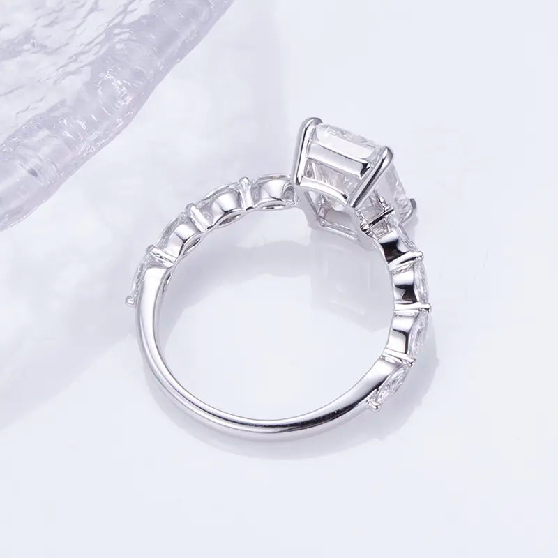 - Side Stones: Round and marquise-cut lab-grown diamonds in shared-prong setting